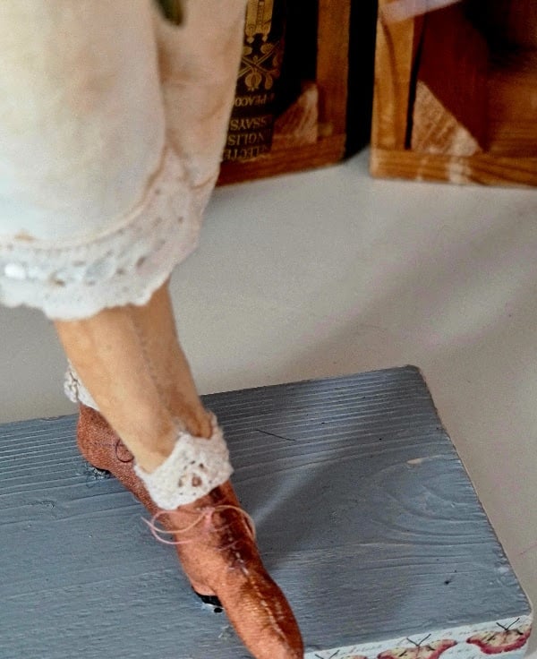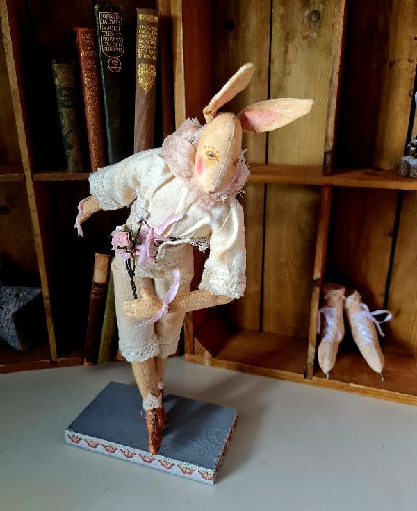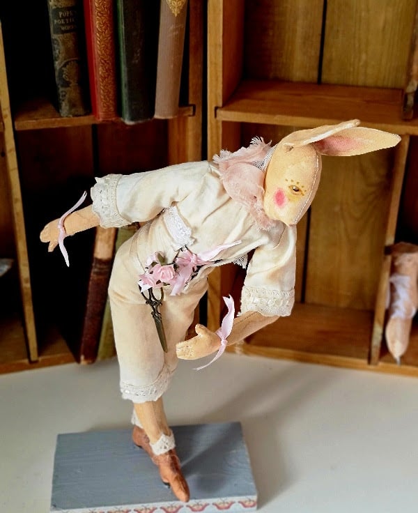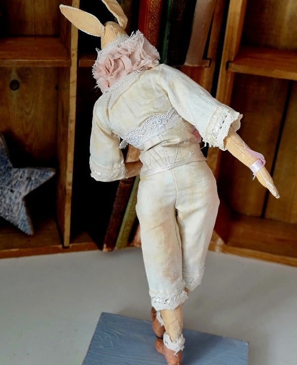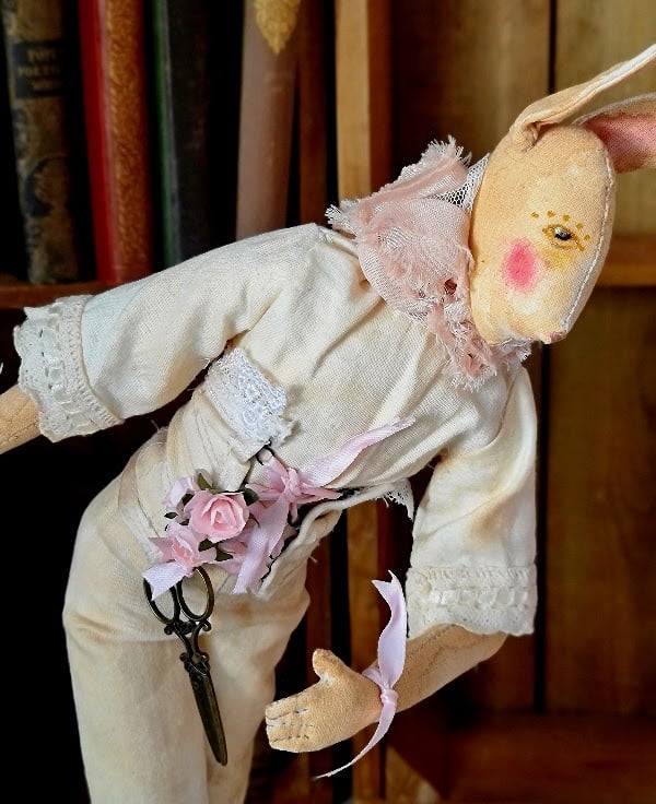 This piece is hand and machine stitched in unbleached cotton, hand stained to look aged, as well as hand painted. He wears breeches trimmed with lace and ribbon, his handmade corset is tied with pink satin ribbon. On his corset is tied scissors and the flowers he cut is tucked inside.