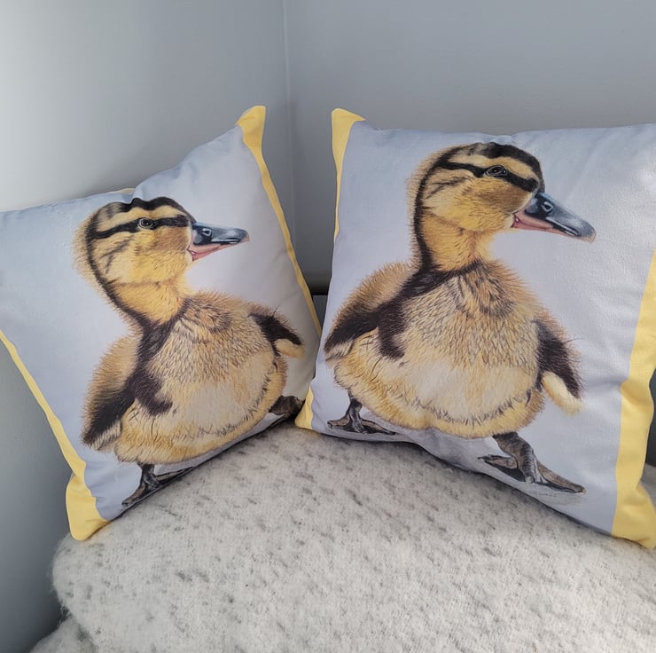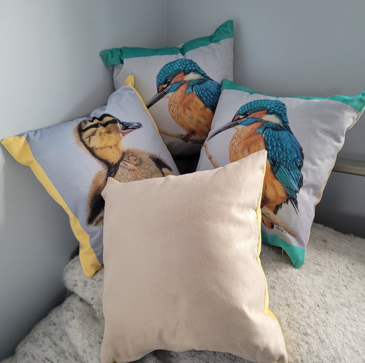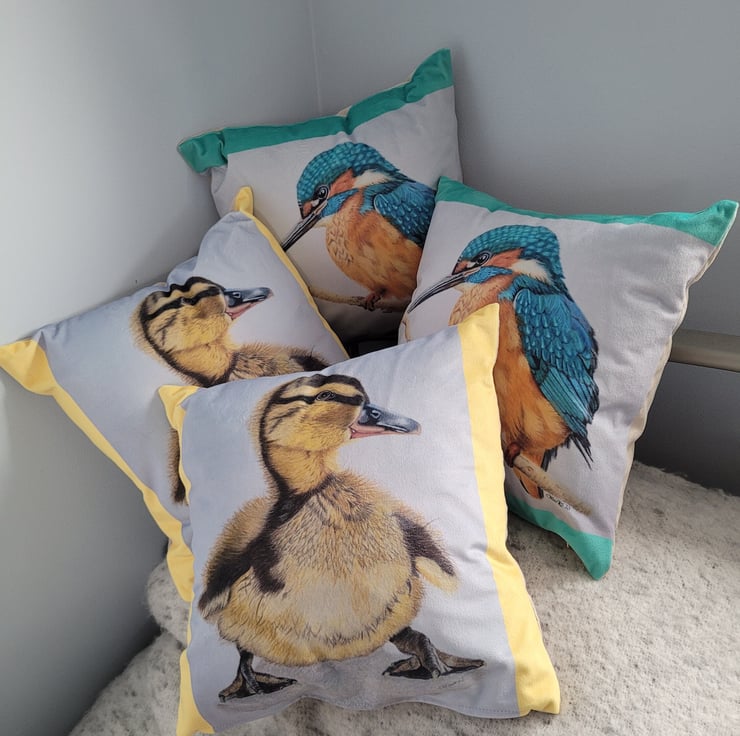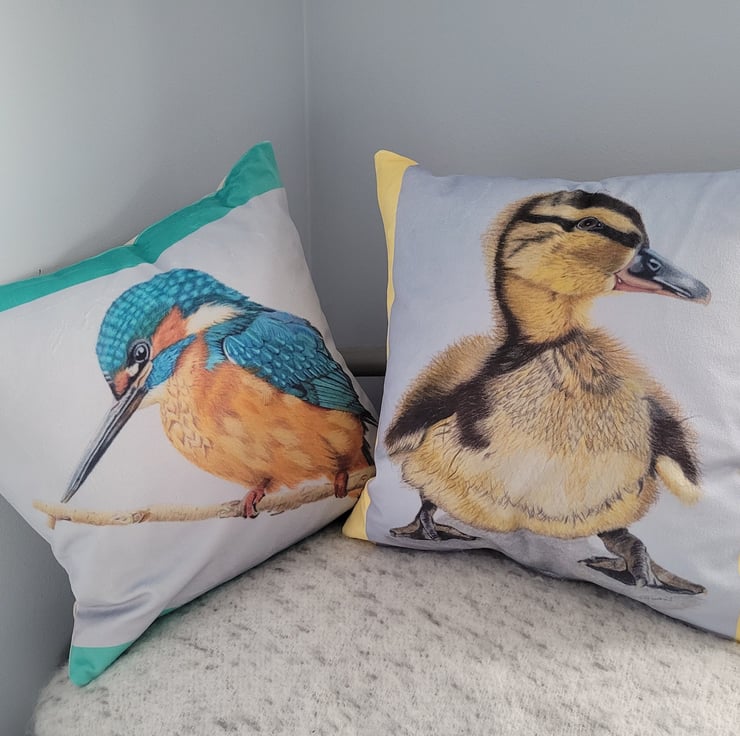 Brighten up any room in your home with these beautifully vibrant cushions. Choose from a beautiful kingfisher, cute duckling or quirky Gentoo penguin design. Each cushion features a copy of a coloured pencil drawing by CM Creative.
