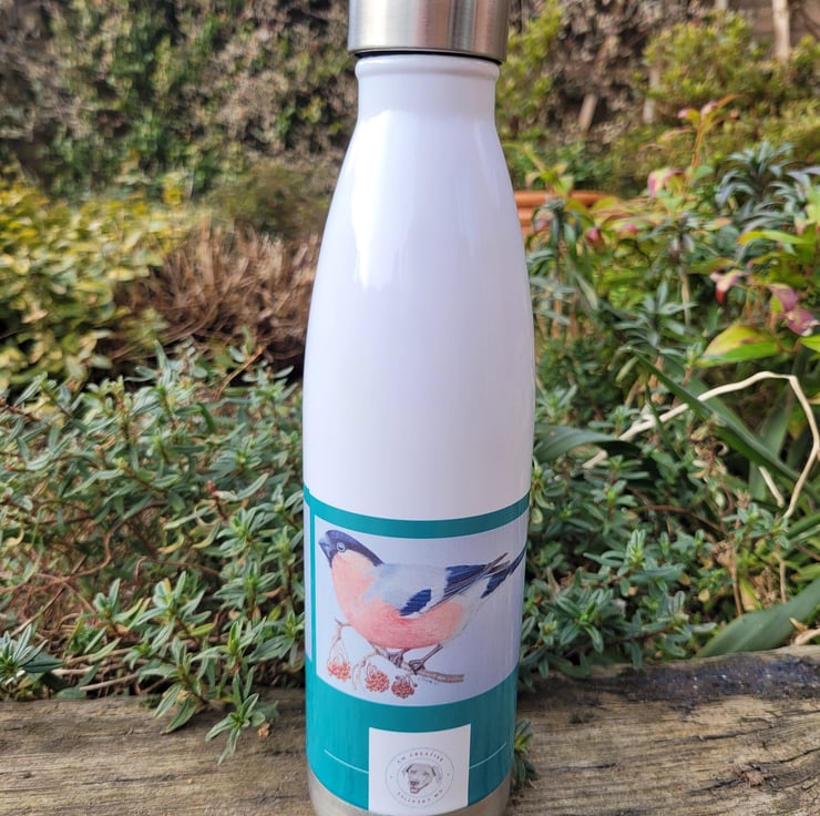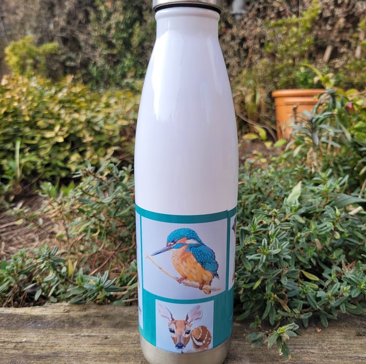 This insulated water bottle will keep your drink cold for hours, perfect for anyone on-the-go. It has a stunning animal design including a kingfisher, deer, duckling and bullfinch along with the CM Creative logo. The pictures are prints of beautiful, coloured pencil drawings by CM Creative.