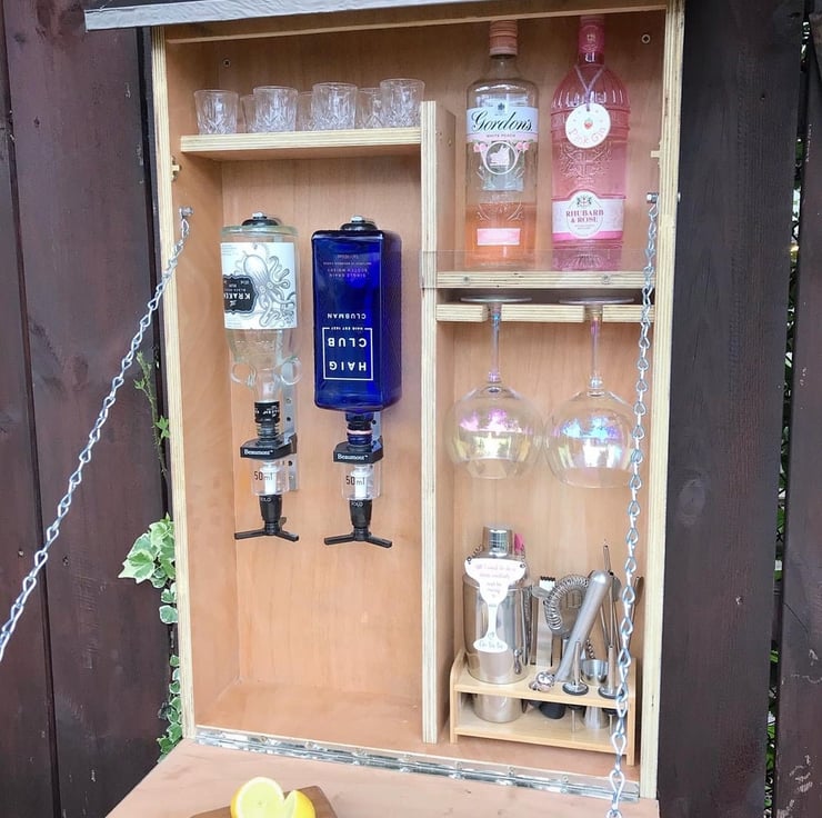 It features 2 optics and a fold down table secured by chains which all closes up neatly when not in use. It has 2 slots inside to hang gin balloons or wine glasses, a shelf with slots to hold up to 7 shot glasses, a shelf with a perspex front to safely hold up to 3 bottles and a space at the bottom which can be used to store cocktail accessories (as shown in pics) or other glasses etc. The roof is pitched and covered with a protective plastic material to prevent water getting inside and it is sealed with cuprinol grey paint which is also water proof. (If you would like it to be left blank to paint a different colour please let us know) The inside is sealed with a waterproofing oil to highlight and enhance the natural grain of the wood. NO accessories or drinks are included this is for the empty bar only with 2 fitted optics.