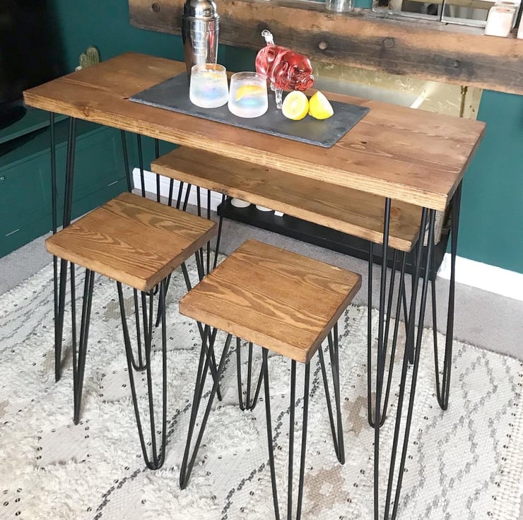 All tables etc are handmade here in our workshop. They are all individual and unique one off pieces lovingly made from reclaimed and repurposed timber set on strong steel hair pin legs.