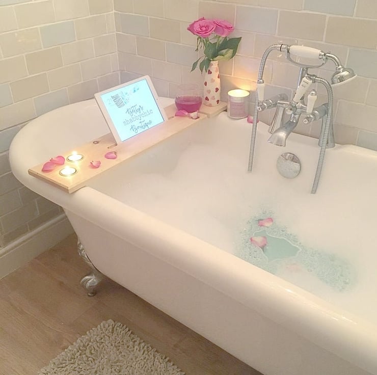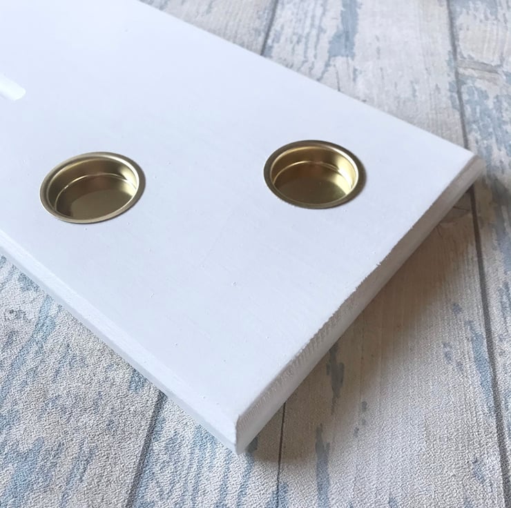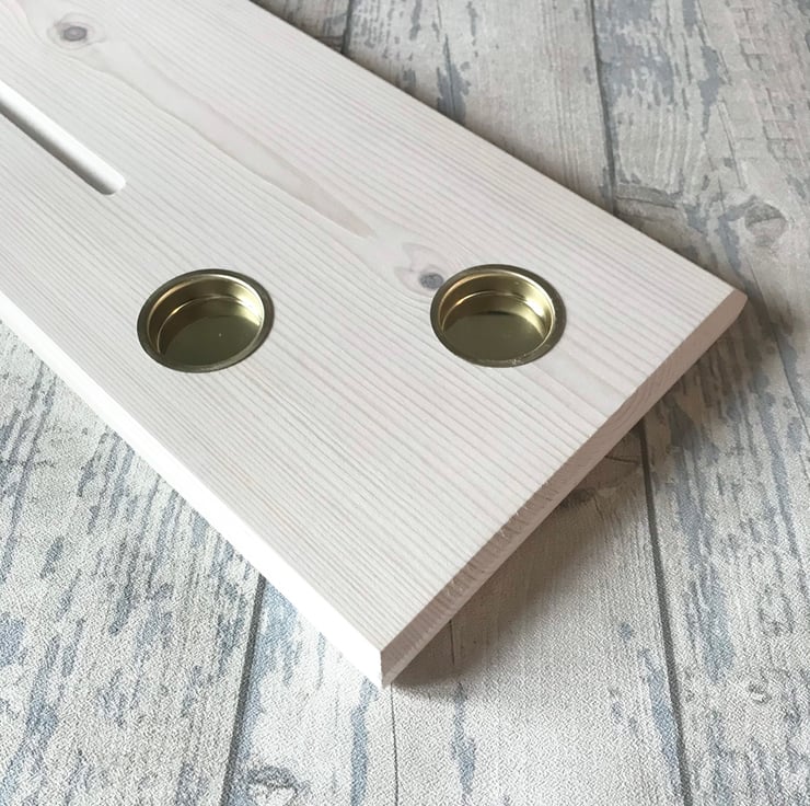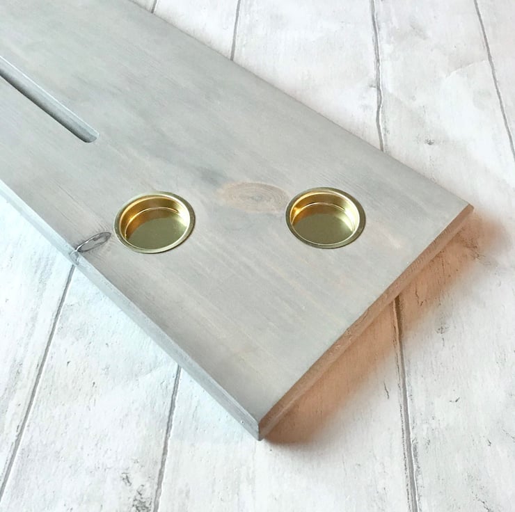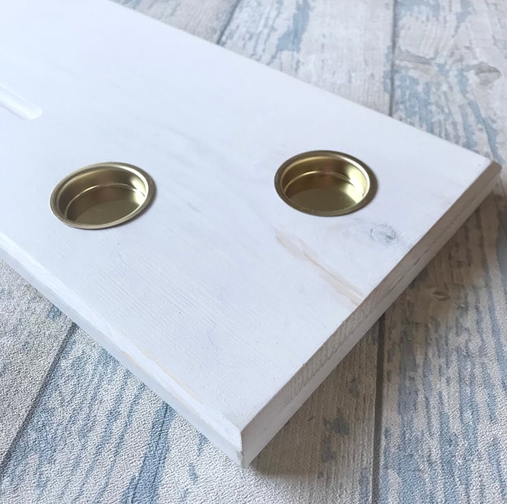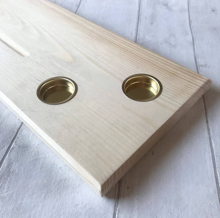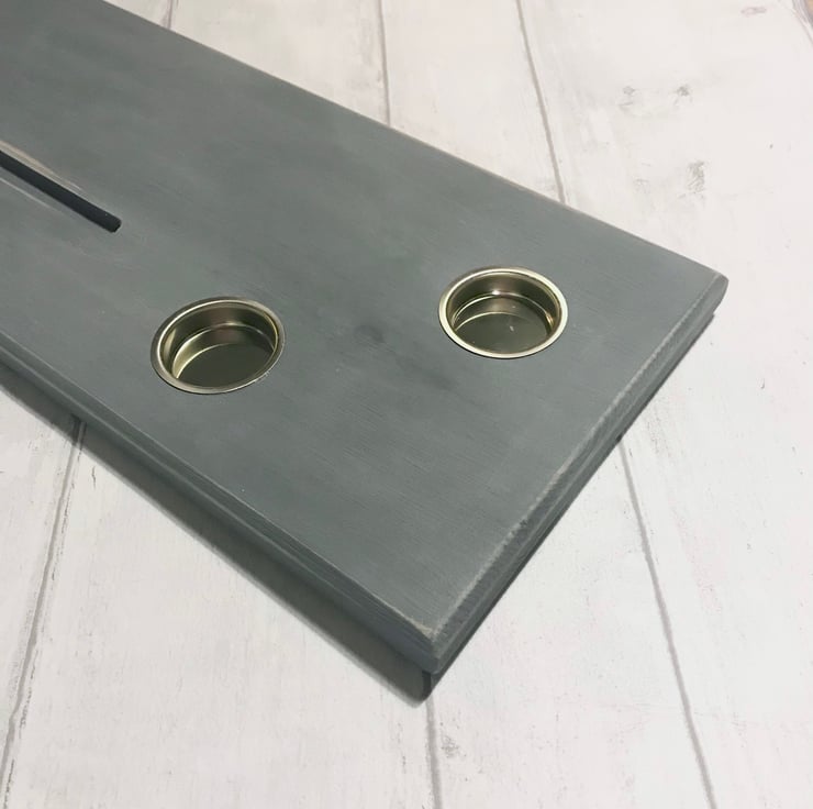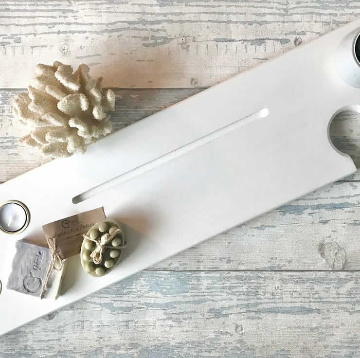 Hand made bath caddy with chrome tealight holders and wine glass keyhole or circle for a mug please choose which you would like sealed to protect from water splashes, with inlaid metal tealight inserts for fire safety these come including 2 tealights so make the perfect present. These can be finished in various options to suit different styles, if the finish or colour you are looking for isnt here just send us a message.