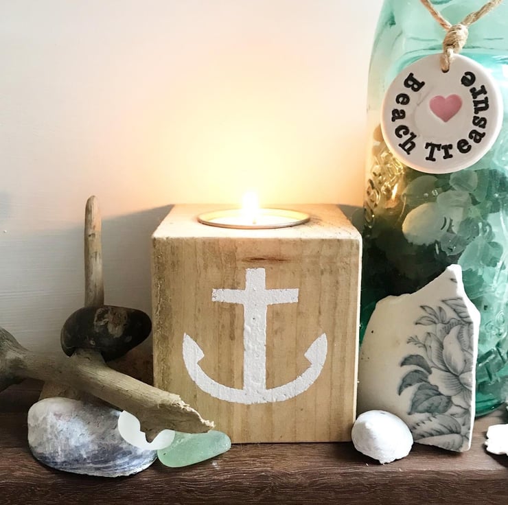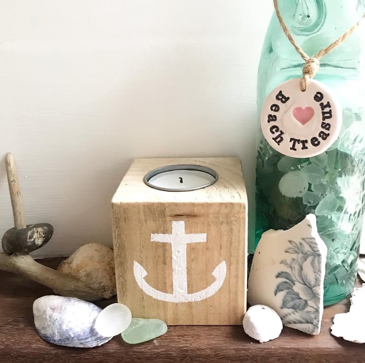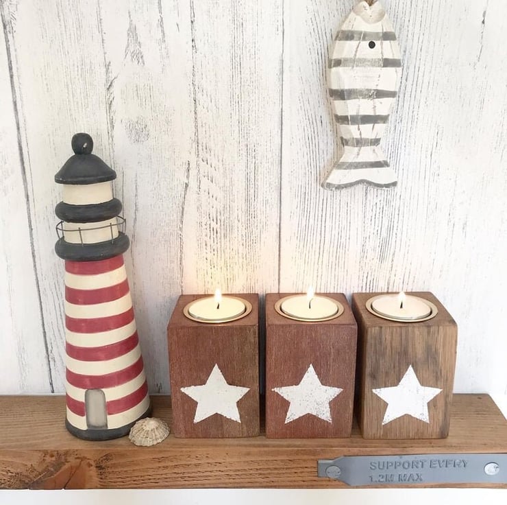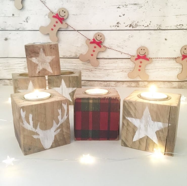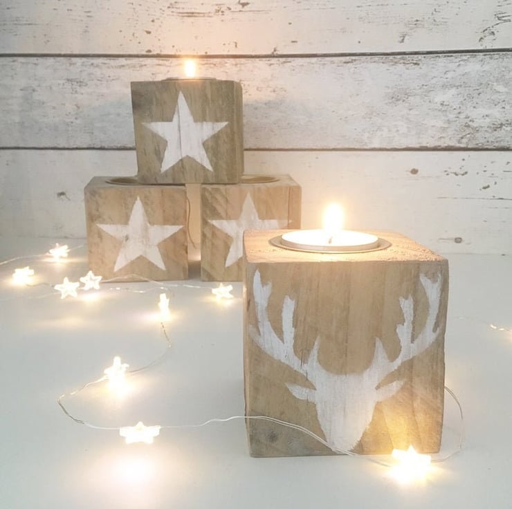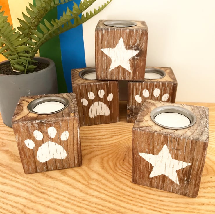 Hand made wooden tealight cubes painted with chalk paint and sealed with clear wax, with an inlaid metal insert for fire safety they include 1 tealight so make the perfect present.