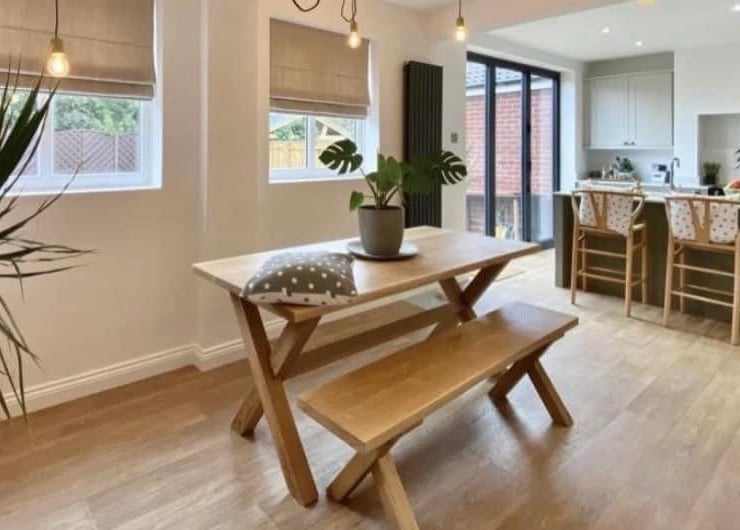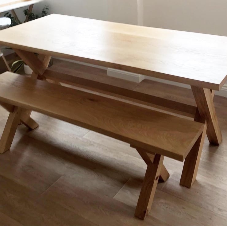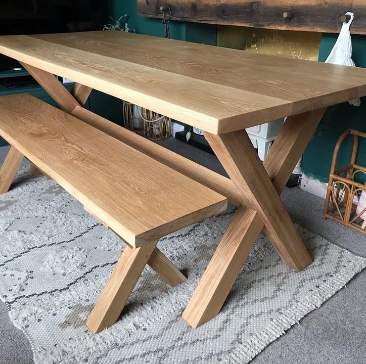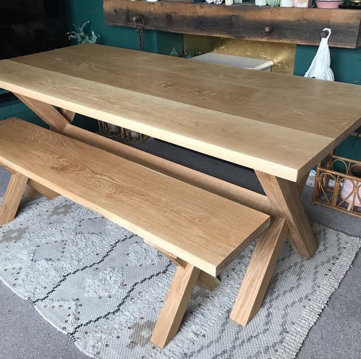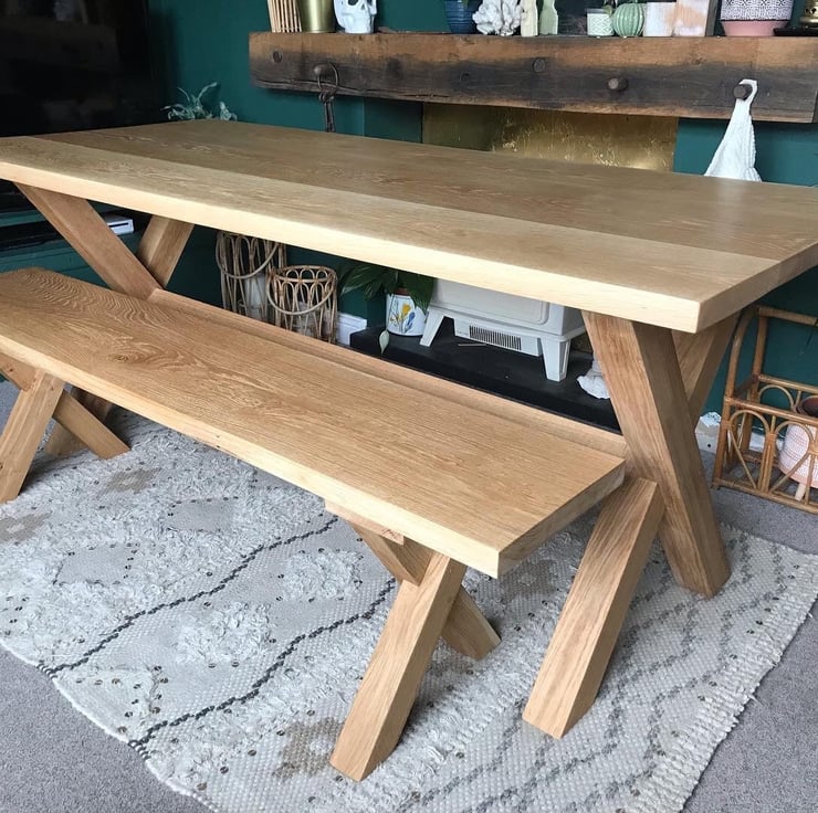 Made to order solid oak dining table and 2 matching benches.