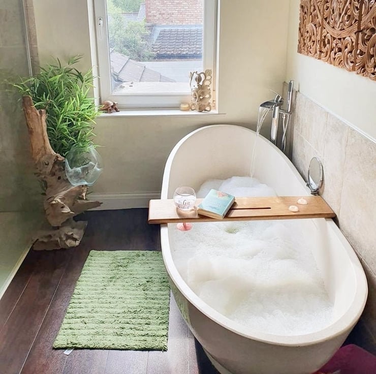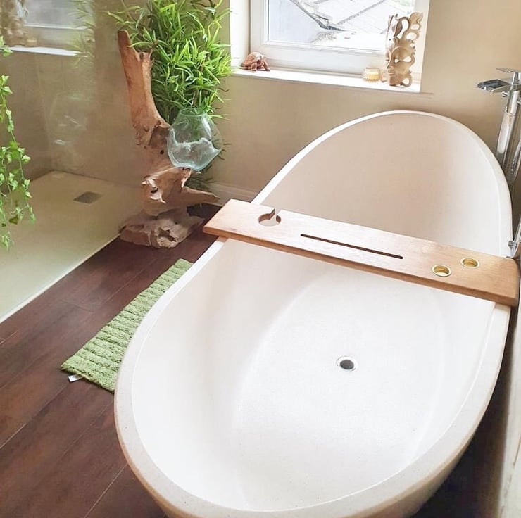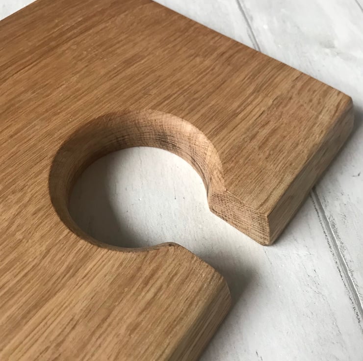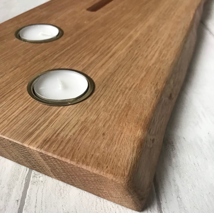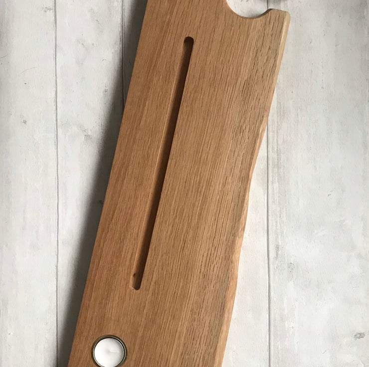Hand made solid oak bath caddy with metal tealight holders and wine glass keyhole sealed to protect from water splashes, with inlaid metal tealight inserts for fire safety these come including 2 tealights so make the perfect present.