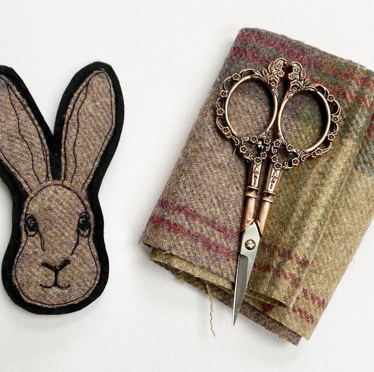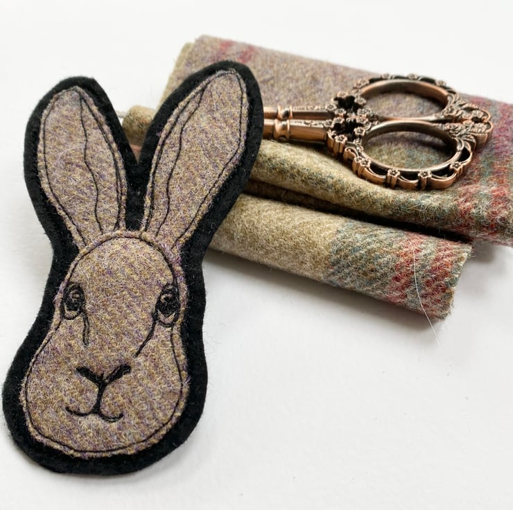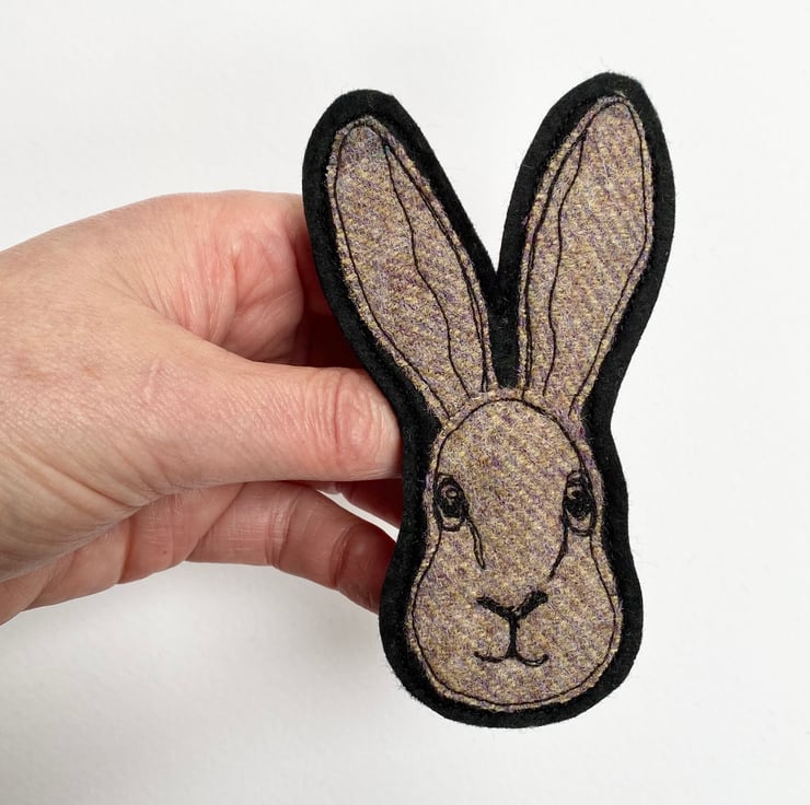 This unique handmade free motion embroidered hare brooch is made from up-cycled fabrics. It is felt backed, and has a brooch pin with a catch on the reverse to keep it nice and secure. It measures 6.5 x 10cm approx.