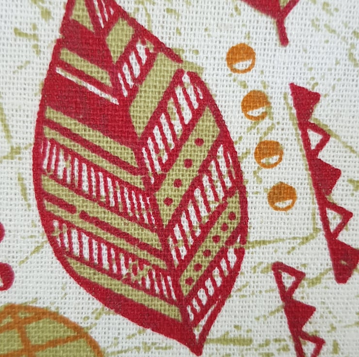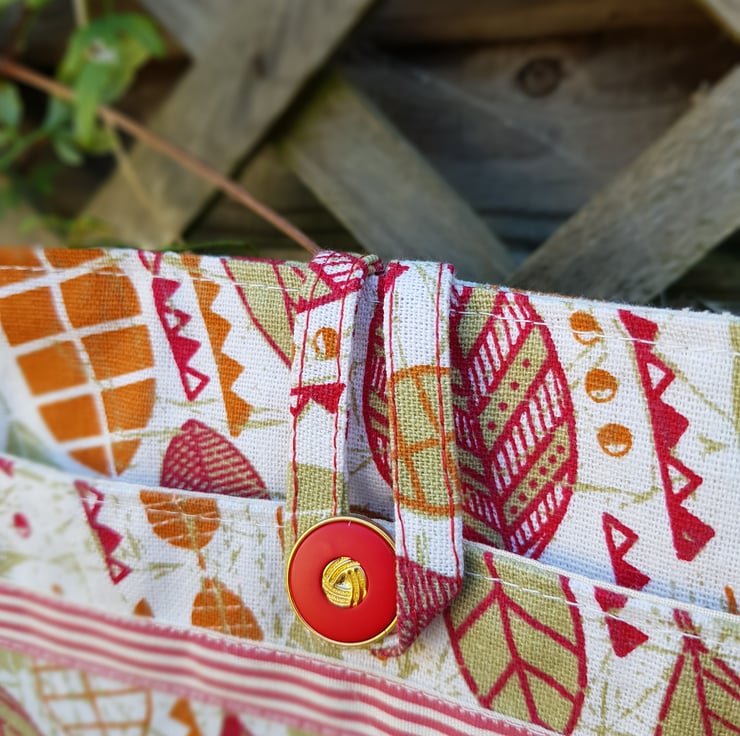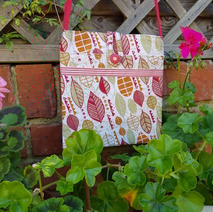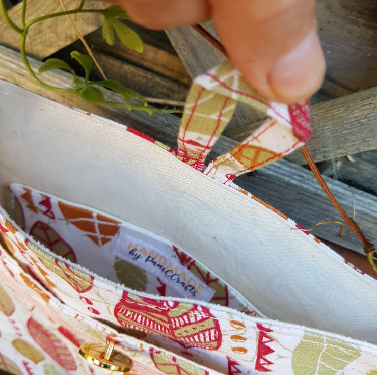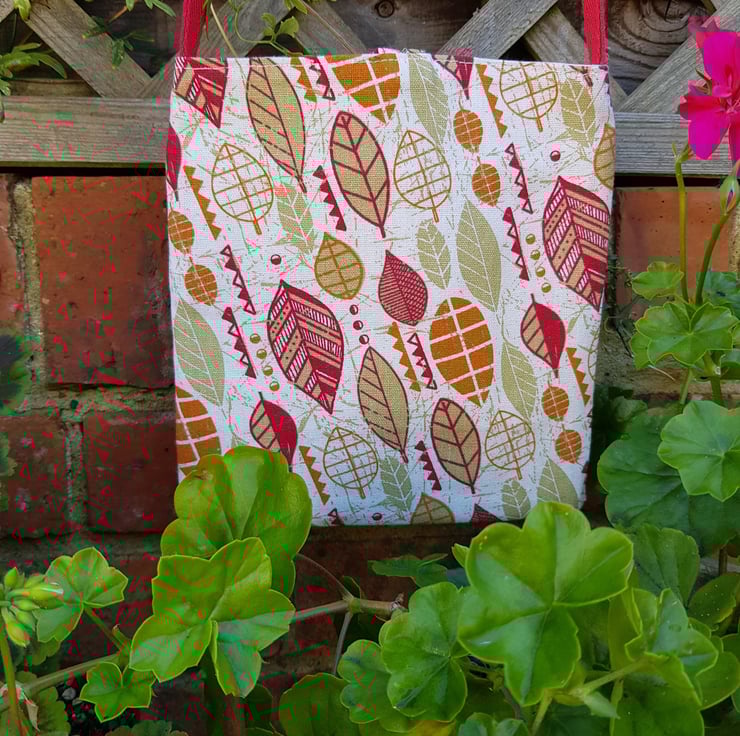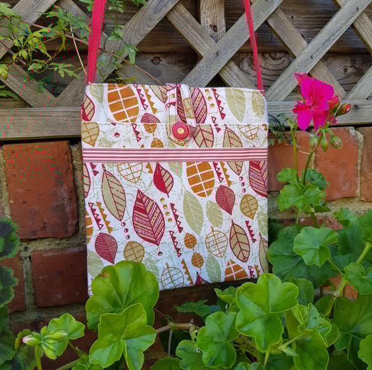 A remnant of curtain fabric has made this lovely crossbody bag. The fabric is a strong cotton canvas and the bag is fully lined with calico . There is a full width front pocket and a smaller pocket inside. The cotton herringbone webbing strap is approx 1.25m. The bag measures 21cm x 23cm.