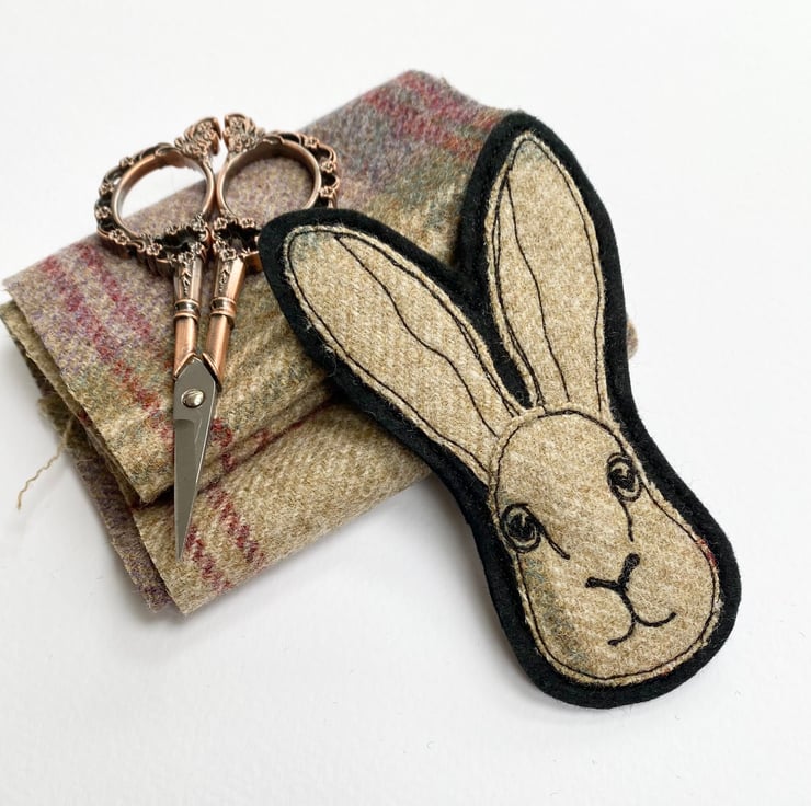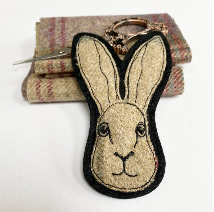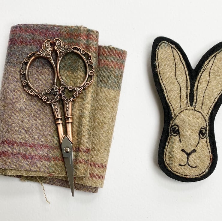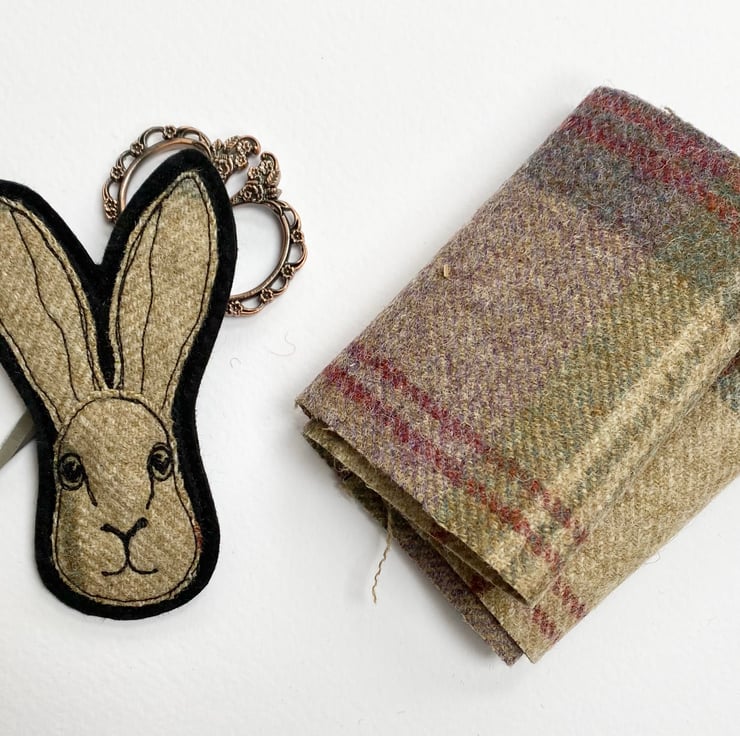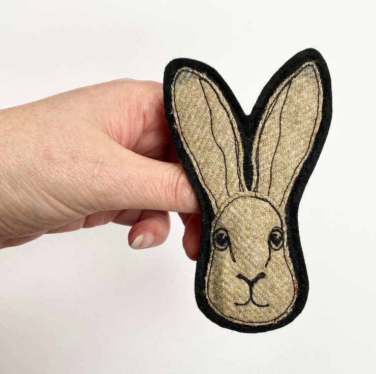 This unique handmade free motion embroidered hare brooch is made from up-cycled fabrics. It is felt backed, and has a brooch pin with a catch on the reverse to keep it nice and secure. It measures 6.5 x 10cm approx.