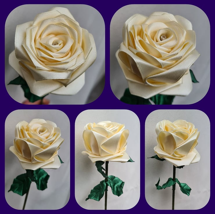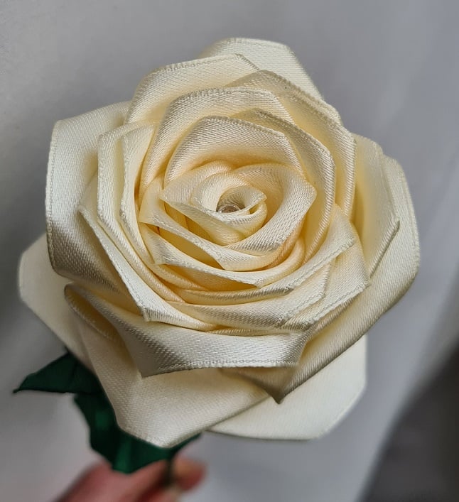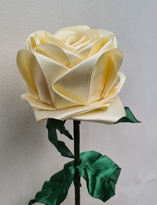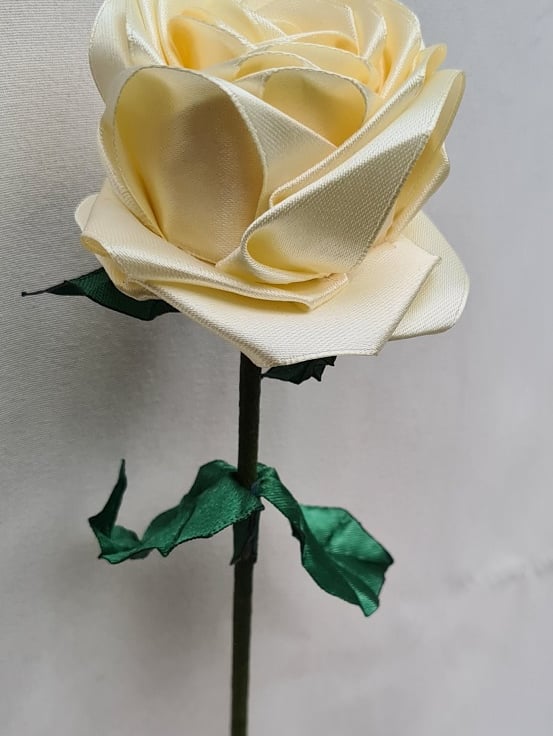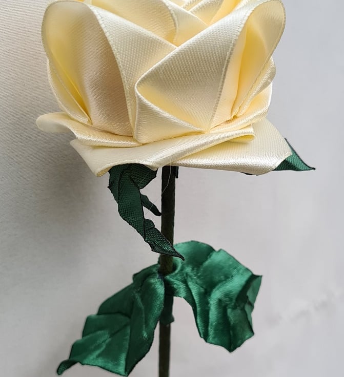 Gorgeous Handmade Ivory Ribbon Rose - Long Stem Artificial Forever Flower Gift.