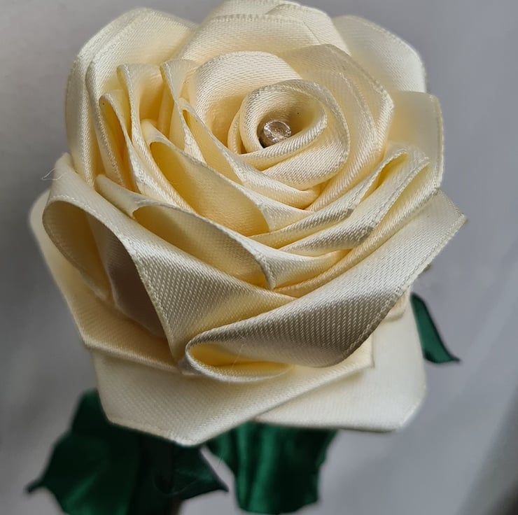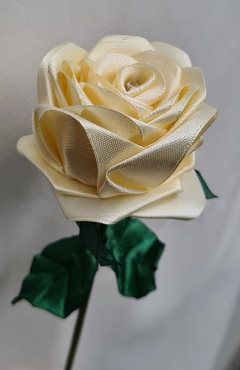 A beautiful handmade single stem rose (one flower only), made with a gorgeous Ivory Satin (Polyester) ribbon. This ribbon is so lovely, and is fantastic to use to create beautiful things with. The stem is made from bamboo (Non-bendy) and Wrapped with a Green floral tape and the leaves are made from a Dark Green Satin ribbon.