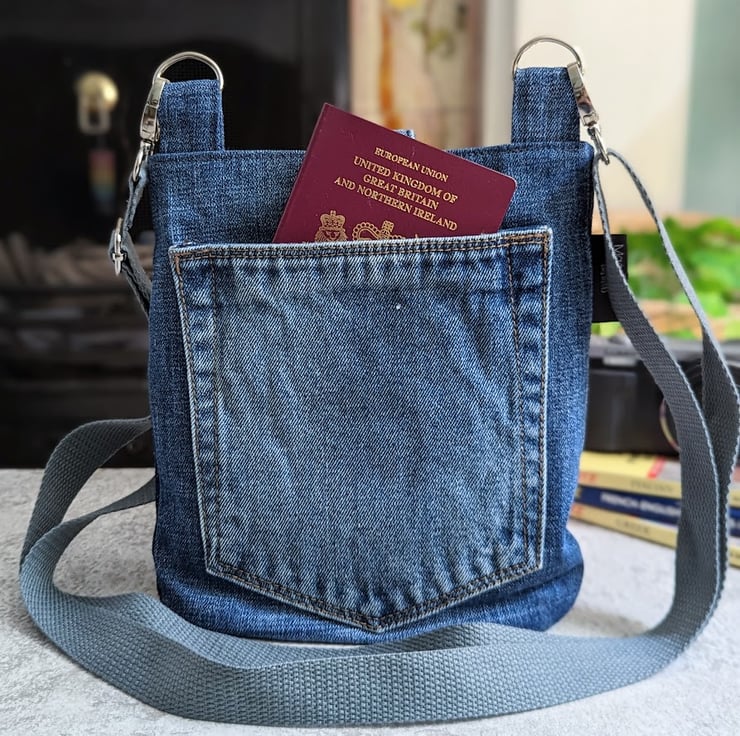 Handmade, and reducing waste by using pieces of recycled denim jeans that are no longer wanted, I've made the most of the character of the denim with the back of the bag having a usable jeans pocket with a hidden pocket behind. The hidden pocket is secured with a plastic snap closure.