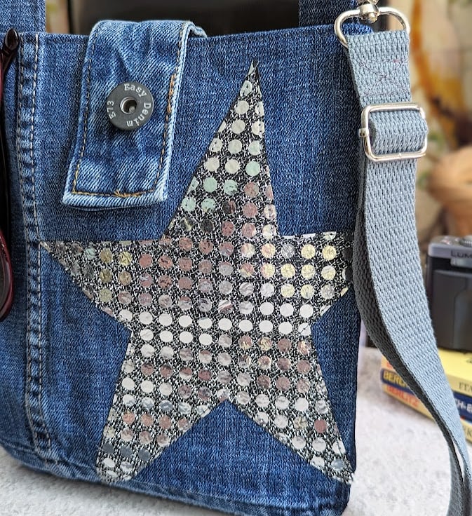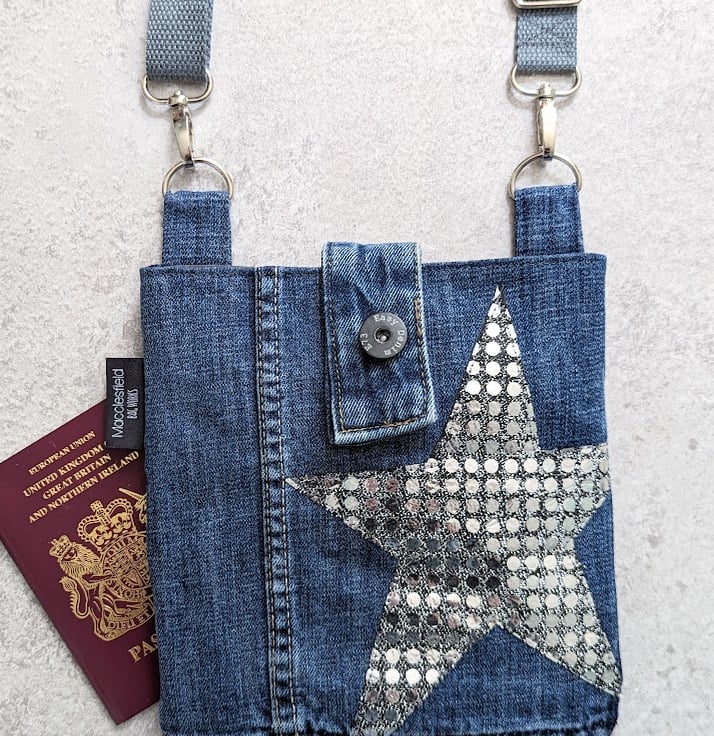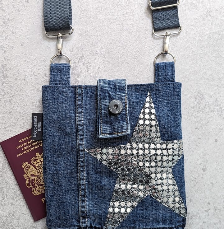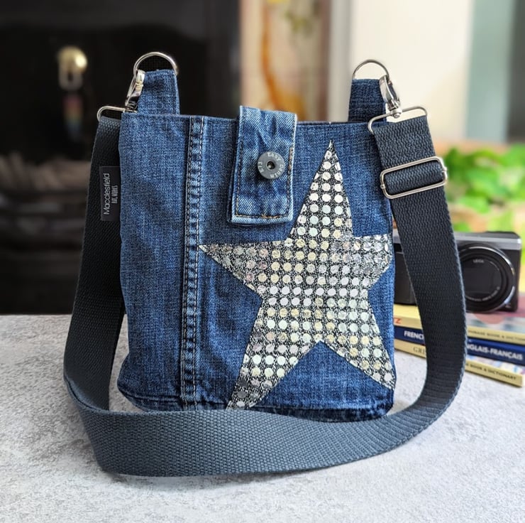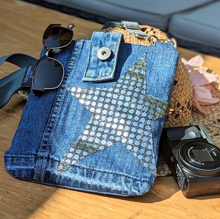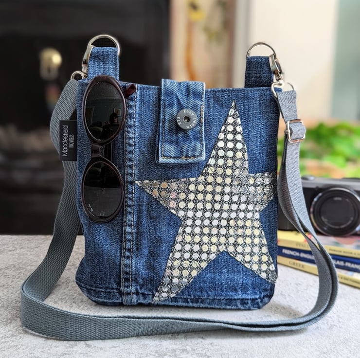 Preloved denim jeans have been reworked to make this upcycled mini cross body bag. With a gorgeous silver star motif, it's perfect for evenings, festivals or just feeling fabulous every single day! Throw in your phone, purse and a few essentials, this little bag has been designed to be light, casual and convenient.