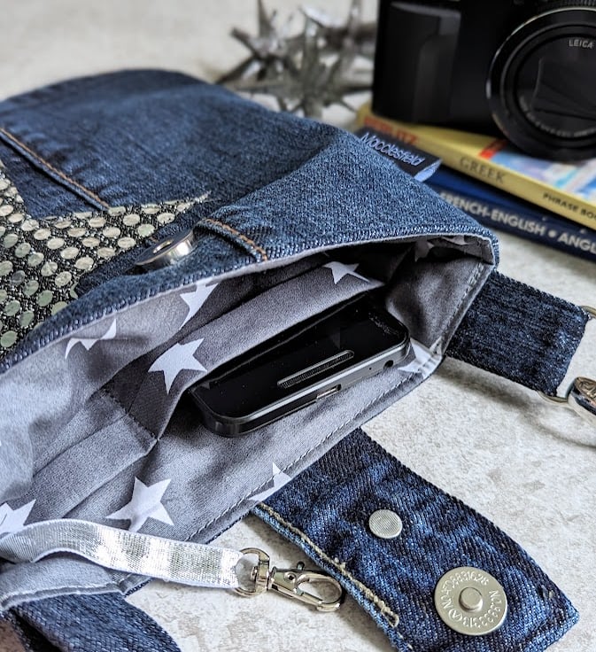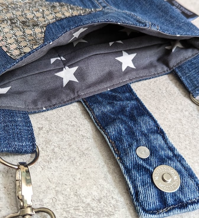It has a grey star print cotton lining. A mid grey strap compliments the silver star motif - but choose navy if you prefer. The strap and attaches to the bag with silver coloured metal lobster hooks and d-rings and is adjustable to approx 162cm. The opening is secured by a flap made from a section of the waistband and is secured with a silver coloured magnetic jeans style button.