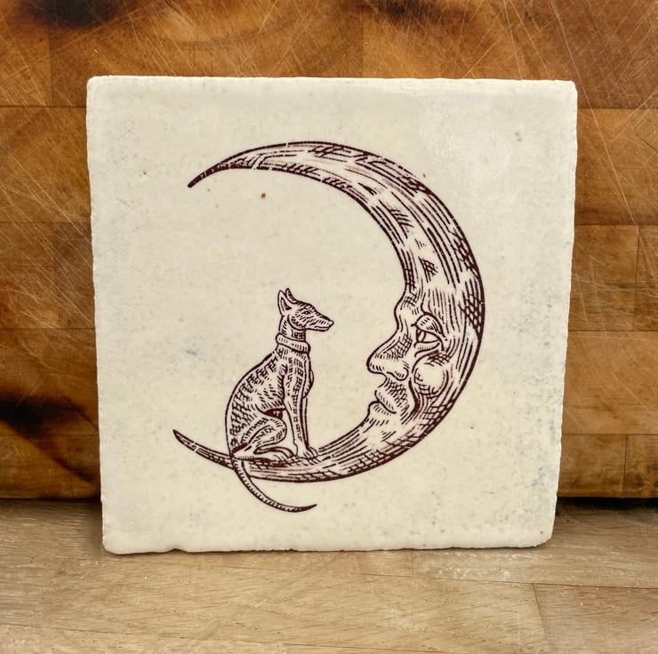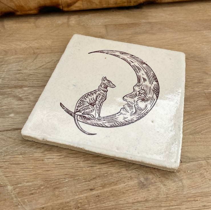 Handmade stoneware tile with Whippet in the moon image, 12cm2 (sepia colour)
