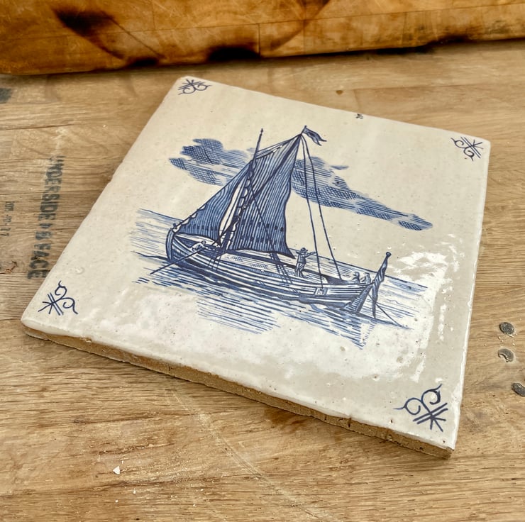 Handmade stoneware tile with Ship at Sea image, large tile 15.5cm2 with a rustic finish and a slight chip in top left corner