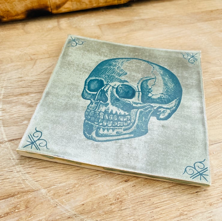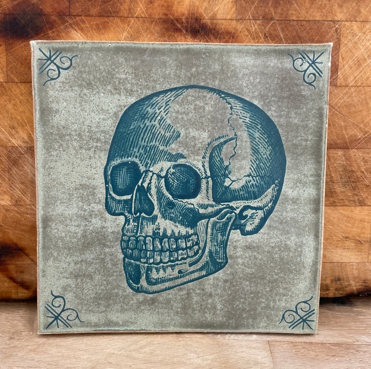 Handmade stoneware tile with skull image, 13cm2 with a matt green/grey finish, slightly warped in the firing process