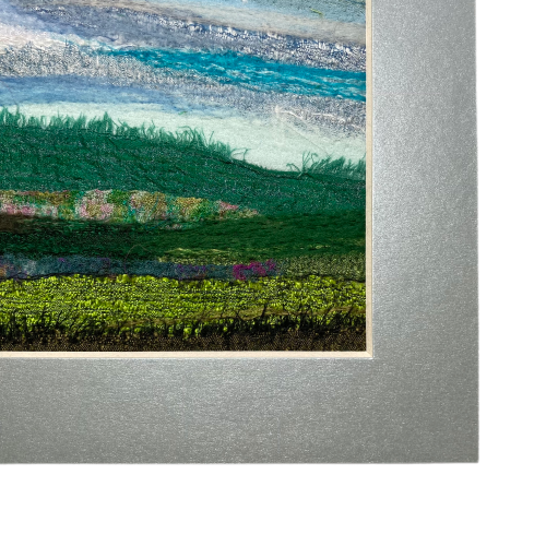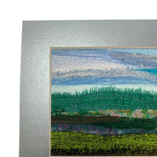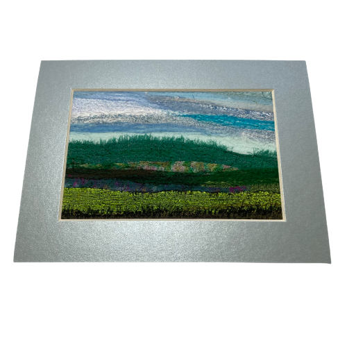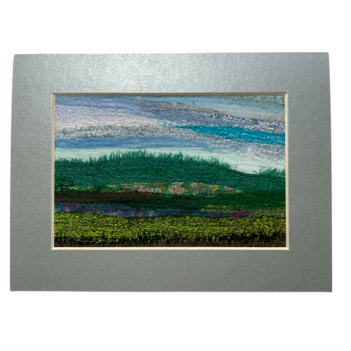 A lovely landscape of fields is the subject of this textile art picture. It has been created from silk fabric and wool and silk fibres using a needle felting technique. Strips of coloured silk fabric have been needle felted to a felt base with additional wool and silk fibres added to the surface to blend the colours together and add texture. No sewing has been used to create this picture as the needle felting process binds the fibres and fabric together. It also add texture to the surface of the picture. The picture has been mounted on a standard a piece of 6"x4" card and is supplied with a light bluish silver 8" x 6" card mount ready to be framed. It is signed on the reverse.