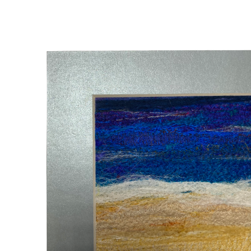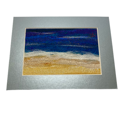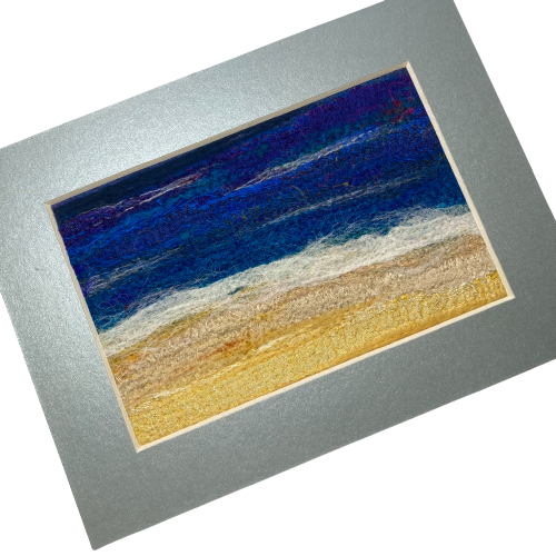 Created using a needle felting technique a beautiful silk and wool textile art picture of ocean waves on the beach. Coloured silk fabric strips have been needle felted to a felt base with additional wool and silk fibres added to the surface to blend the colours together and add texture. The needle felting process binds the fibres and fabric together and also add texture to the surface of the picture. The picture has been mounted on a standard a piece of 6"x4" card and is supplied with a light bluish silver 8" x 6" card mount ready to be framed. It is signed on the reverse.