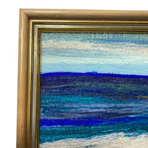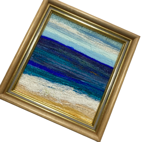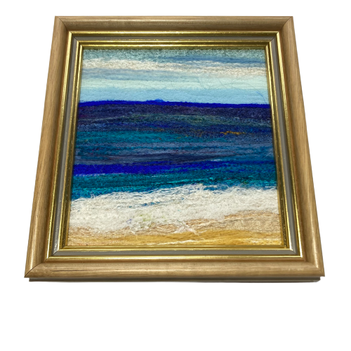 This beautiful textile seascape of ocean waves on the beach has been created using coloured silk fabric strips and woollen and silk fibres. The strips of silk fabric have been needle felted to a piece of backing felt. The needle felting process binds the fabric to the backing felt. Wool and silk fibres have been added to blend the colours and create further detail and texture. No stitching has been used in the creation of this picture. In addition to binding the fabrics and fibres, the needle felting creates a beautiful texture to the surface of the picture, with the raw edges of the fabric left exposed in places to add to the artwork.