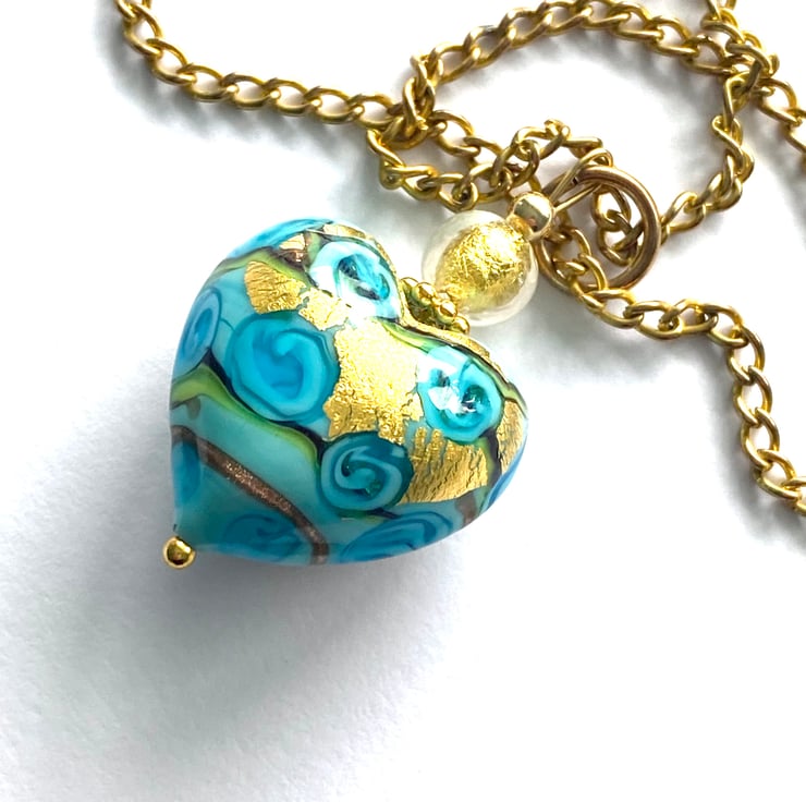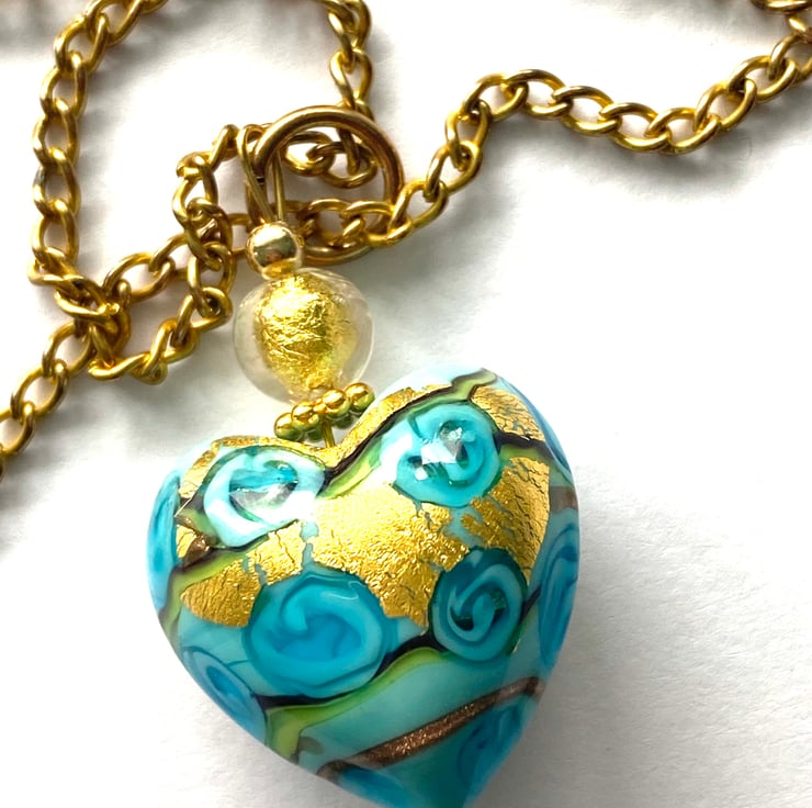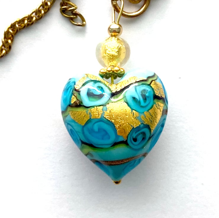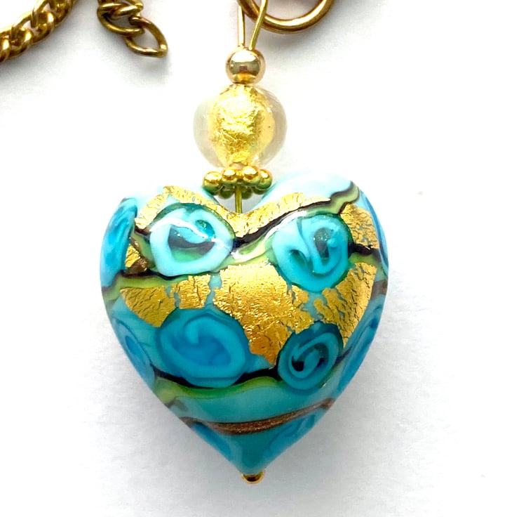 Murano Glass pendant with a 24k gold foiled amore aquamarine and aventurine Murano glass heart bead (20x20mm) with a 24k gold foiled Murano Glass gold round bead and vermeil daisy spacer bead. The heart bead is beautiful with blue flowers scattered across the gold foiled glass base enhanced by gold findings. The pendant hangs from a gold plated chain (18inches). The pendant is presented in a velvet gift pouch and shipped with tracked and signed delivery.