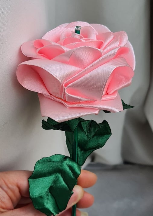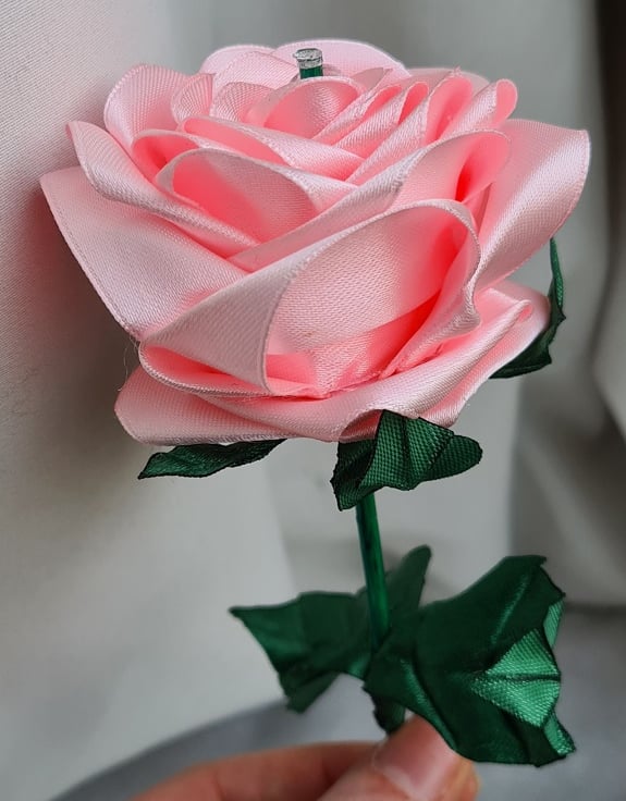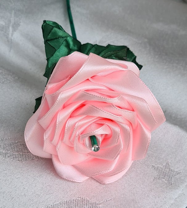 A gorgeous handmade single stem rose (one flower only), made with beautiful Baby Pink Satin (Polyester) ribbon. The stem is made from bamboo (Non-bendy) and painted Green with Dark Green Satin ribbon leaves. A gorgeous artificial flower gift.