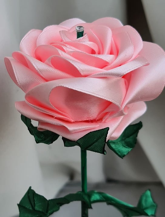 Gorgeous Handmade Baby Pink Ribbon Rose - Long Stem Artificial Forever Flower Gift.