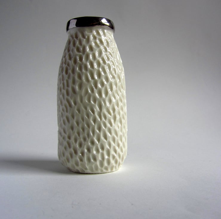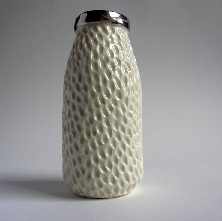 Small porcelain milk bottle vase, with a gold rim, just like the silver top of yesteryear!