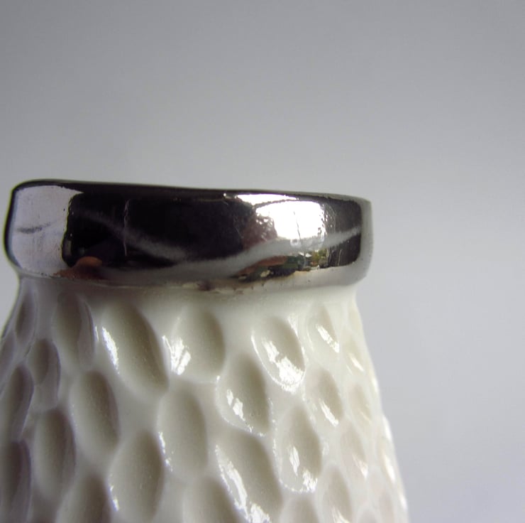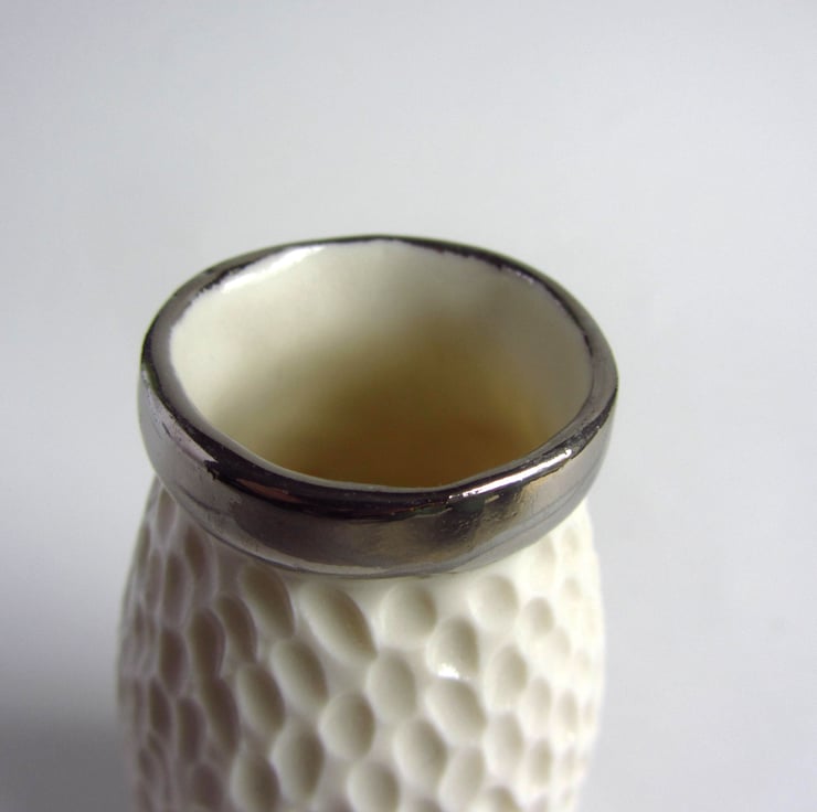 Each vase is individually carved to create the markings in the porcelain. These carvings make each individual vase unique. A gold lustre is applied to the rim and it is fired for a third time.