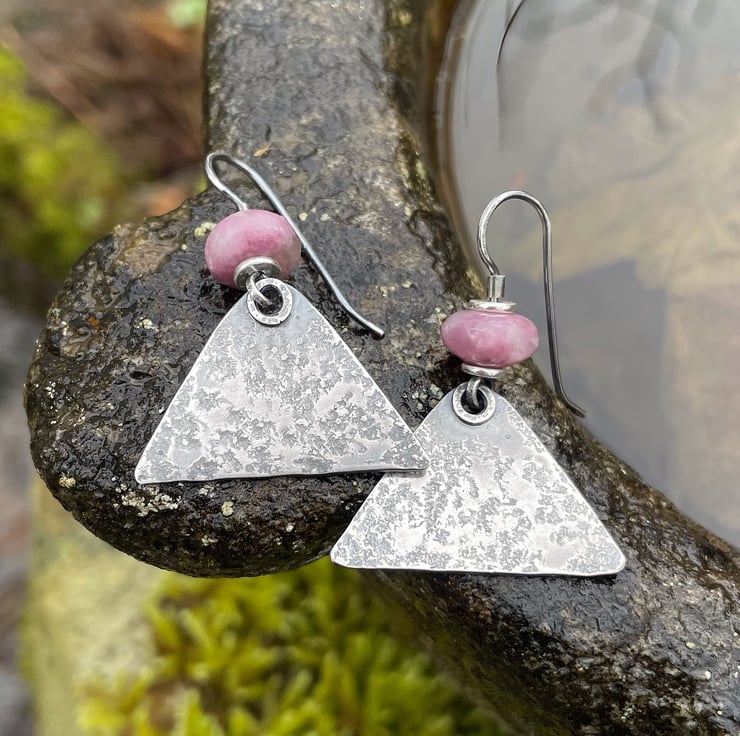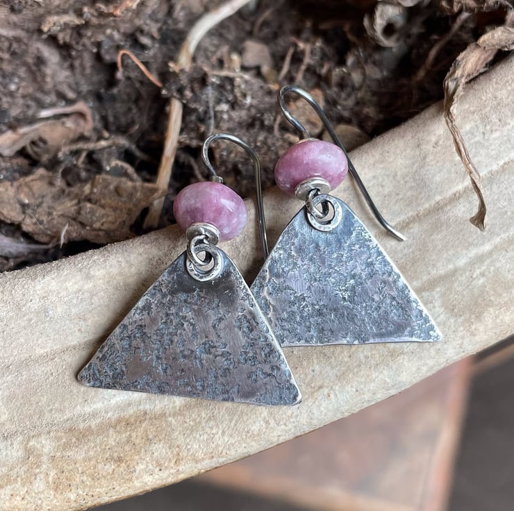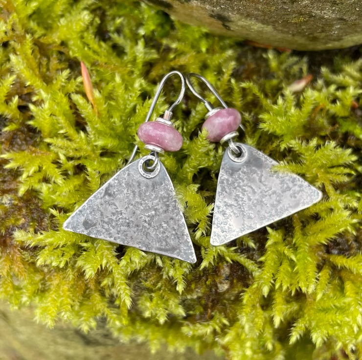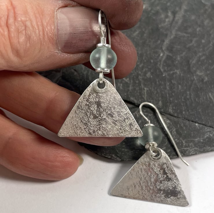 Large triangles of silver have been hammer textured, they have a raised feature eyelet. Oxidised dark in the recesses.