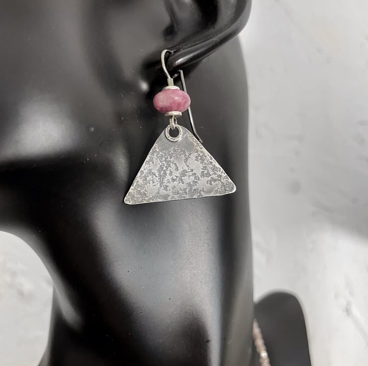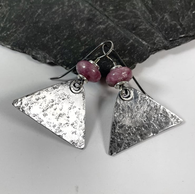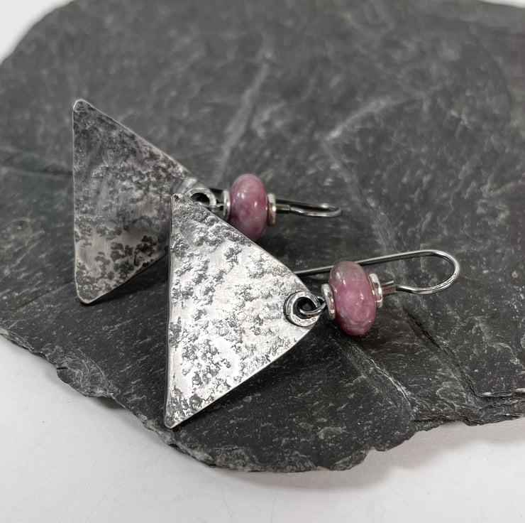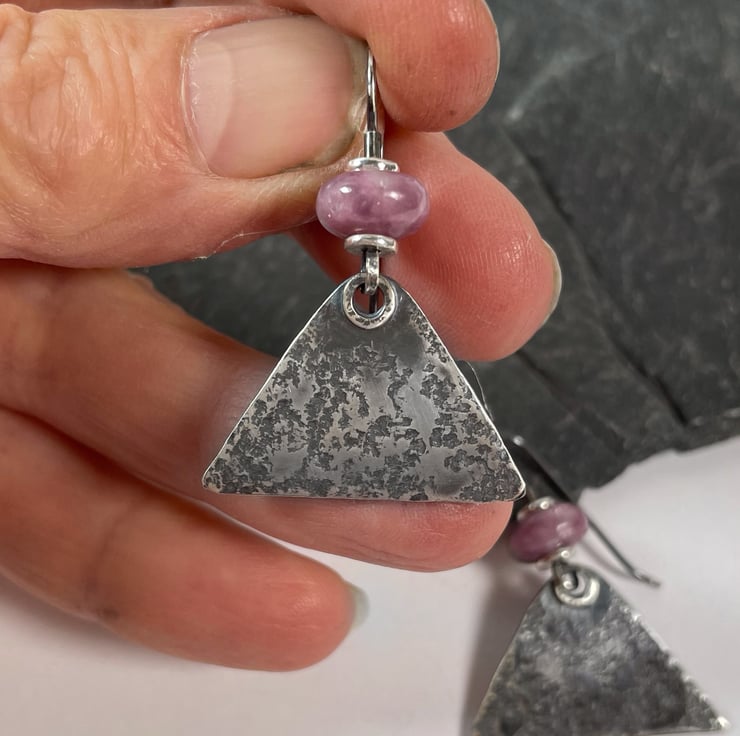 Triangular oxidised sterling silver dangles have been topped with lilac lepidolite roundel beads below silver hooks.
