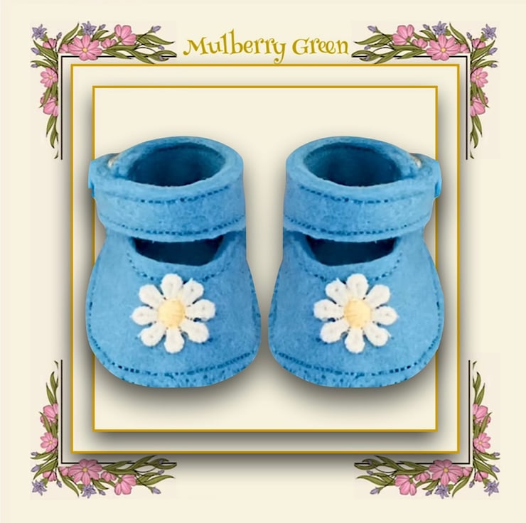 A lovely little pair of pale blue shoes, decorated with daisies, to fit the Mulberry Green characters. They fasten with a little popper underneath a button.