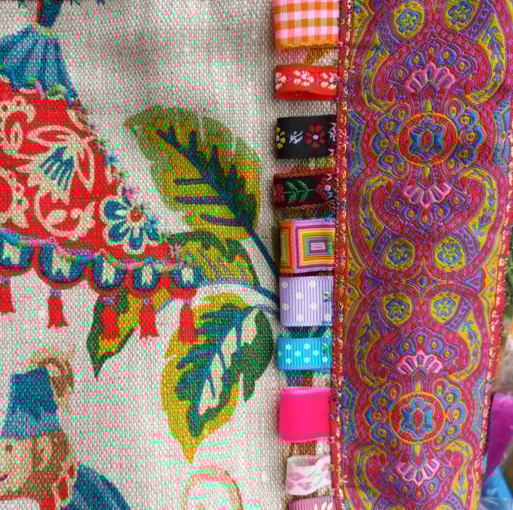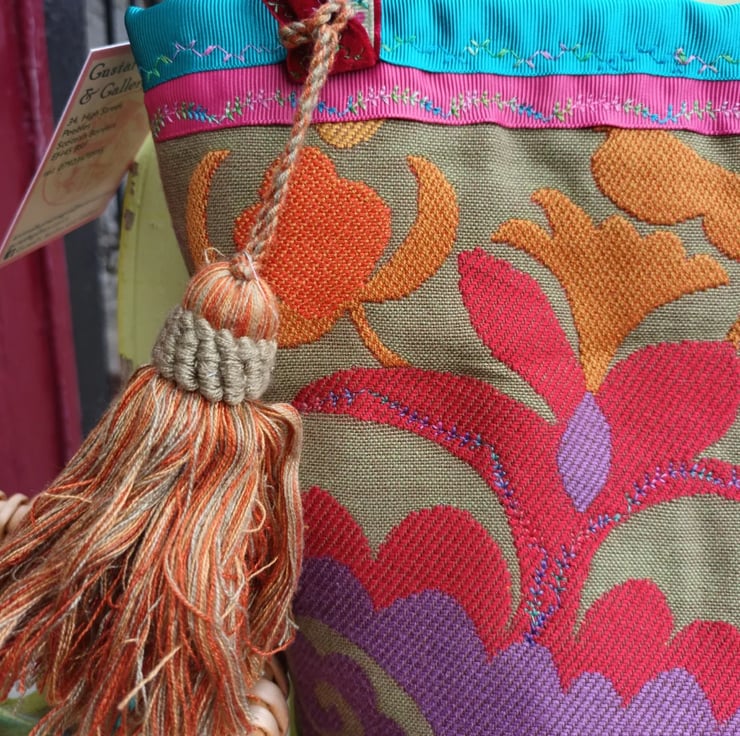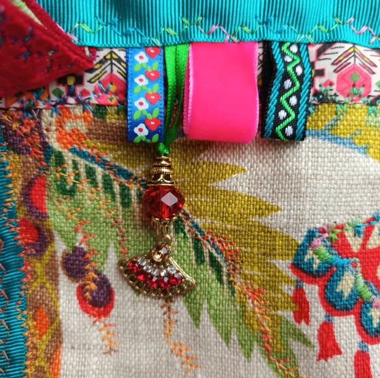 I have chosen beautiful coordinating fabrics from my vintage and Liberty collection, combining them with velvet and gorgeous ribbons and braids. There's a tassel attached to the handle.