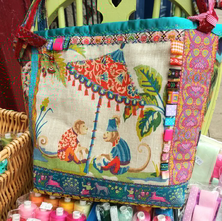 Fabulous Monkey and Parasol linen fabric handbag, hand made in the Scottish Borders.