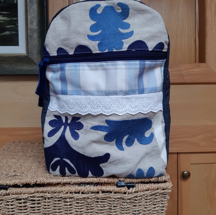Practical backpack in lightweight blue denim, matching plaid panel, broderie anglais lace and embroidered linen on the front, with zipped outer pocket, zipped main compartment and adjustable cotton webbing straps. Lined in coordinating cotton print, with inner pockets.
