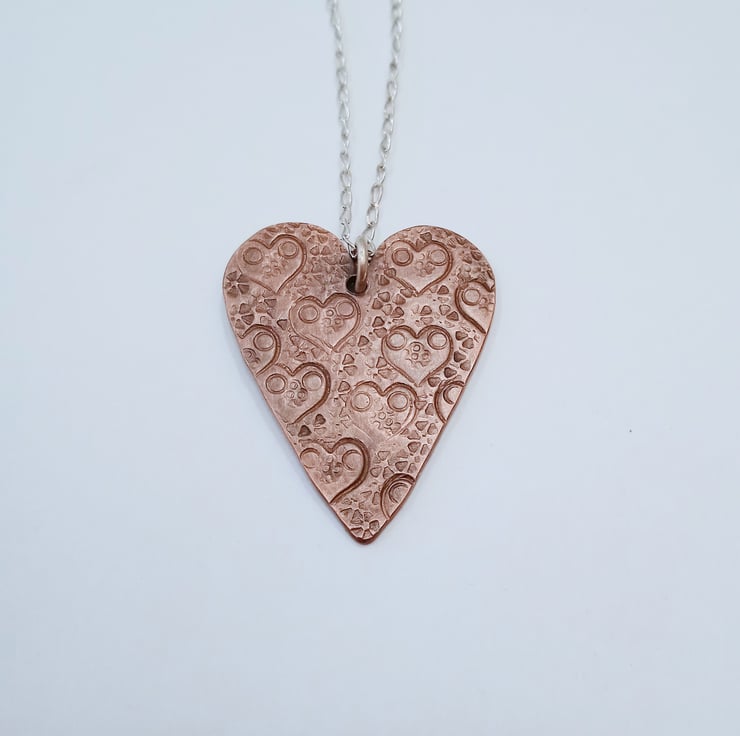 I have created this lovely pendant from a heart I have hand sawed from copper sheet before applying an attractive hand stamped design. I have then lightly oxidised it to give it an antiqued look and to help highlight the design.