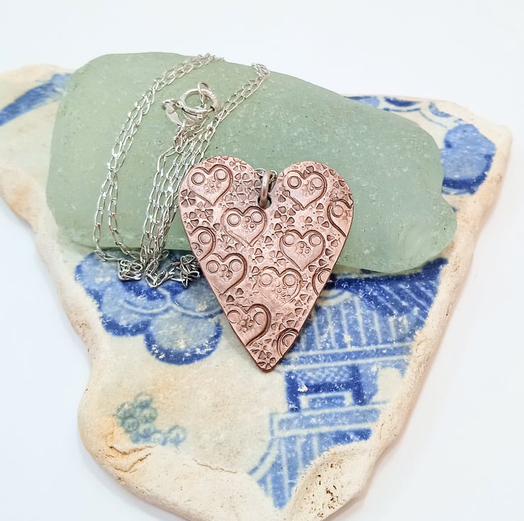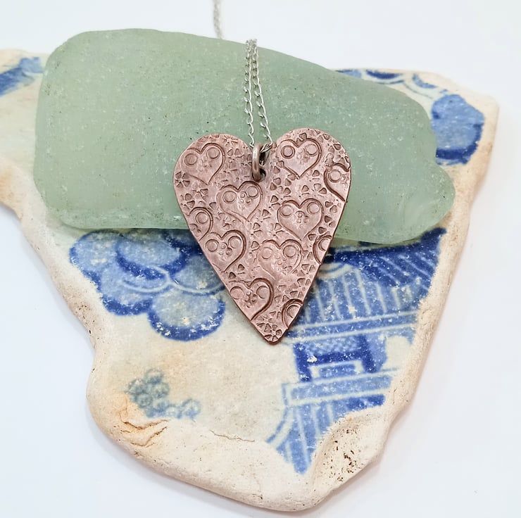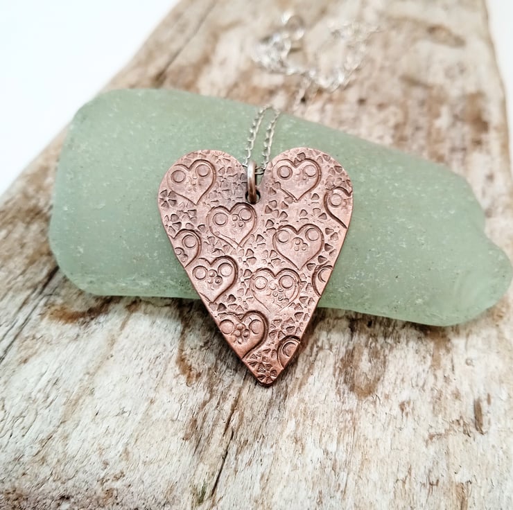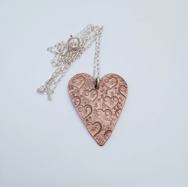 I have created this lovely pendant from a heart I have hand sawed from copper sheet before applying an attractive hand stamped design. I have then lightly oxidised it to give it an antiqued look and to help highlight the design.