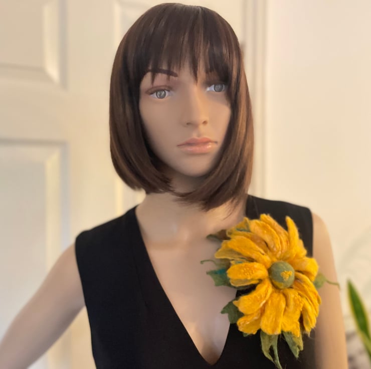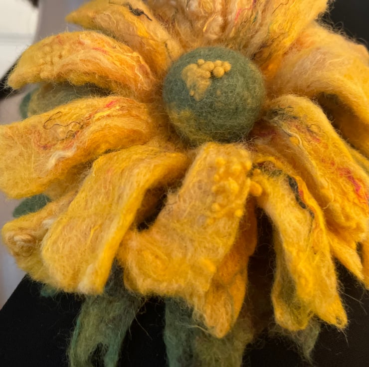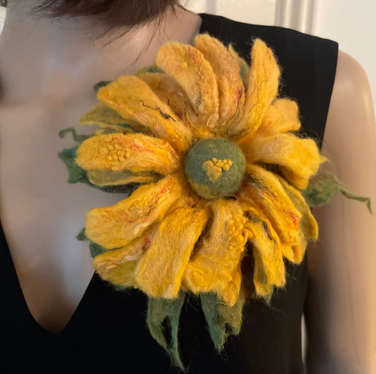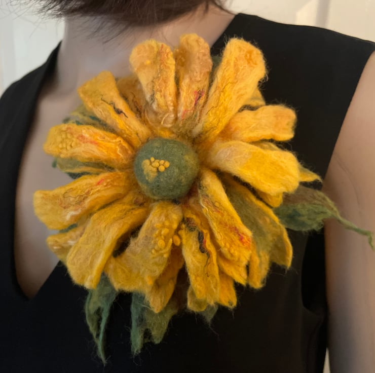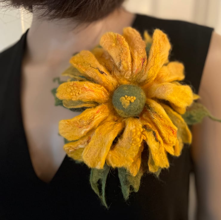 This beautiful Sunflower Brooch was made by me, by hand without the use of patterns, using the best soft organic merino wool in the wet felting technique.
