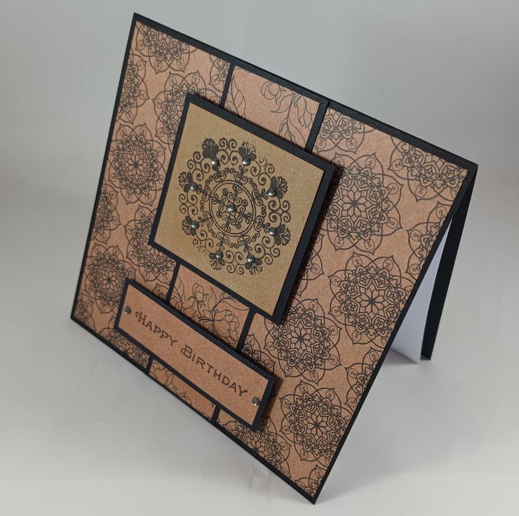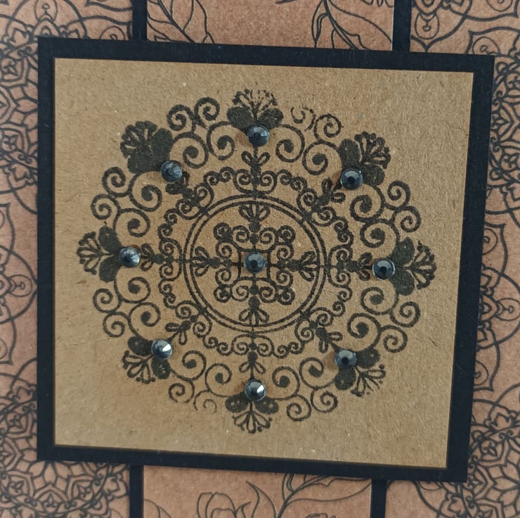 Square handmade birthday card. The card features a stamped mandala image mounted onto black card, along with the sentiment 'Happy Birthday'. Both have been overlaid onto coordinating patterned paper on a black card base. Adhesive gems have been added for a bit of sparkle. The insert has been left blank for your own message.