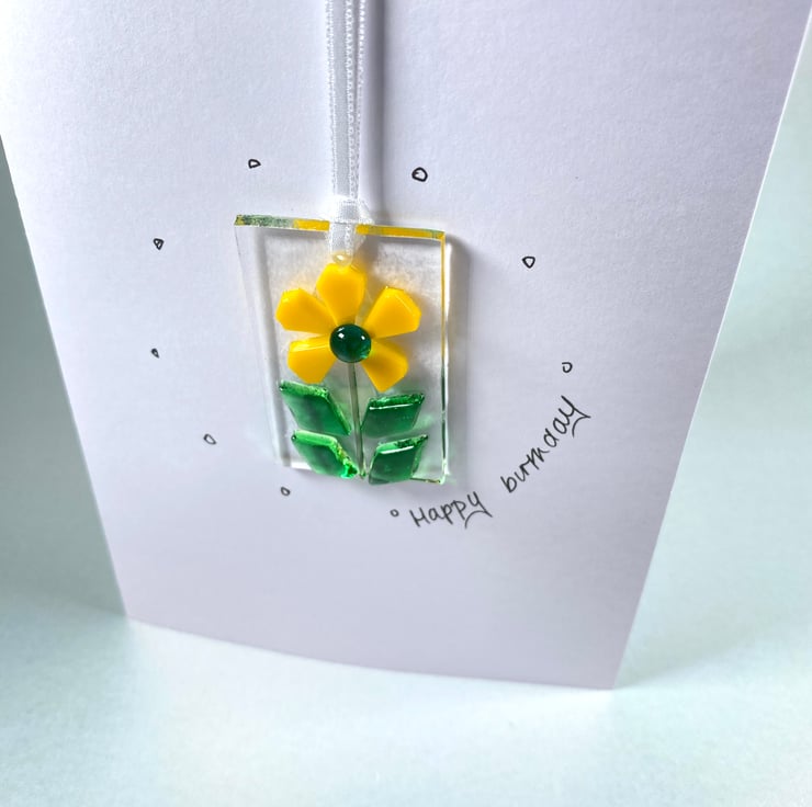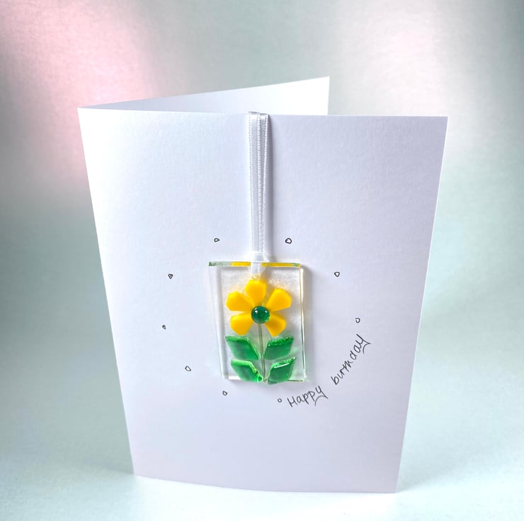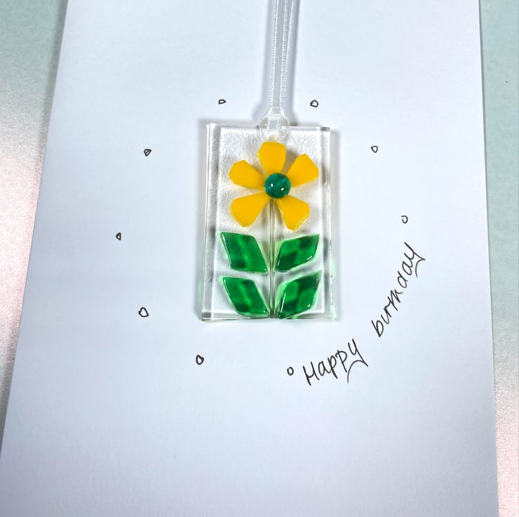 Beautiful hand crafted glass card with hand cut and fused glass hanging flower keepsake . Once the card is no longer needed simply detach the card and hang or frame in your home to remember this gift . A fabulous way to give a card and a gift in one !. Perfect small gift
