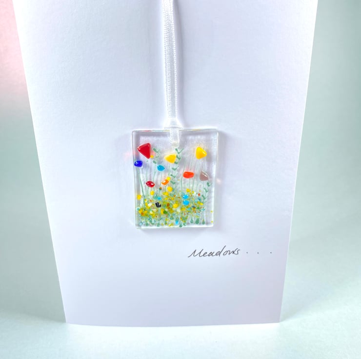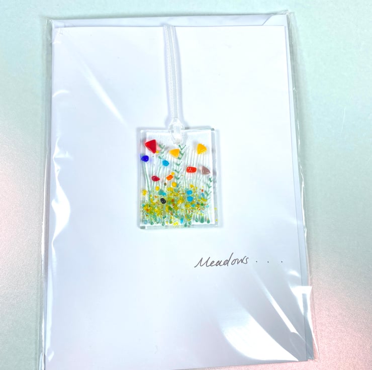 Perfect fused glass “meadow” hanging which can simply be detached from the card when no longer needed. A perfect keepsake and a way of gifting a card and a glass hanging in one . The class hanging has been used by previous customers as a necklace or a glass hanging for anywhere in the home . Each glass hanging is approximately 1.5x 2 inch . I include free second class postage and am happy to post direct , just leave me a note ( notes section) of the short message you wish me to write.