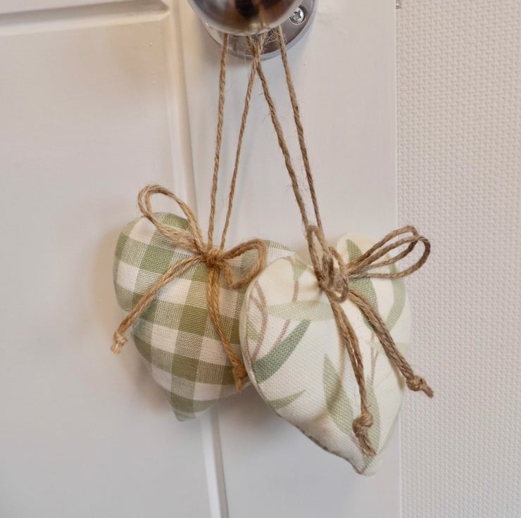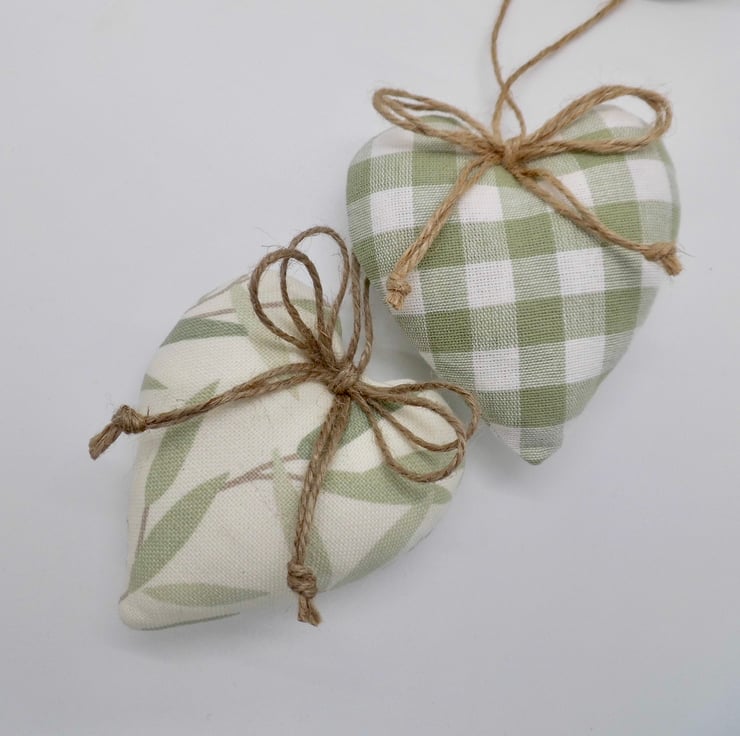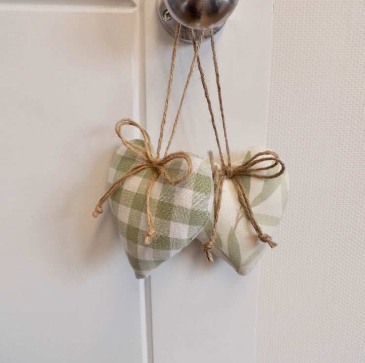 Two heart-shaped door hangers carefully made from Laura Ashley fabric. One is Willow leaf in hedgerow green and one in Heath green gingham. Each heart measures about 11cm x 11cm.