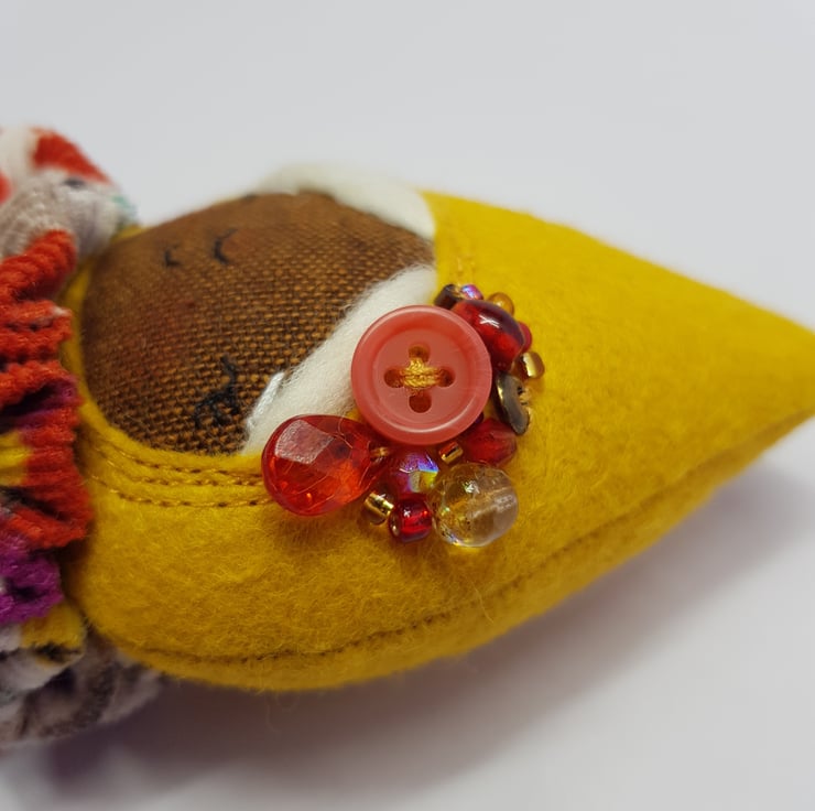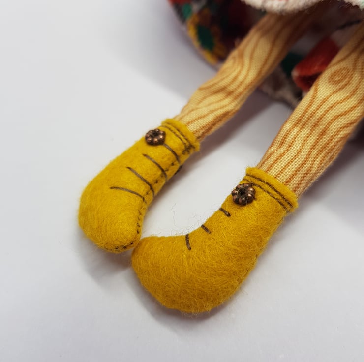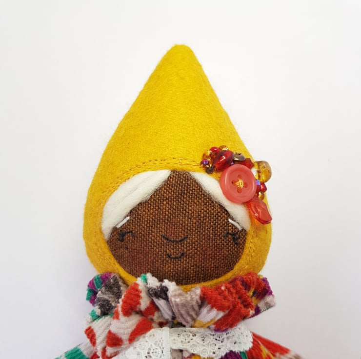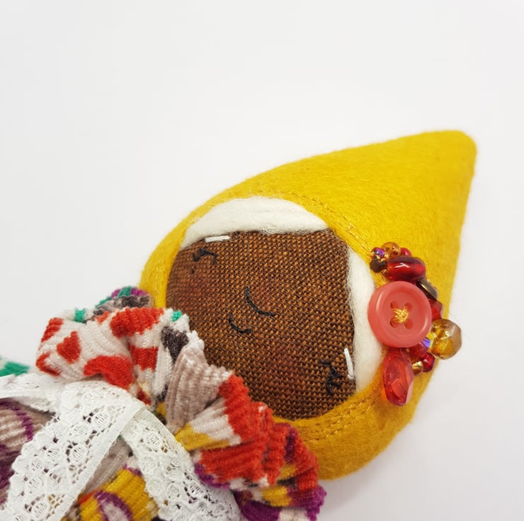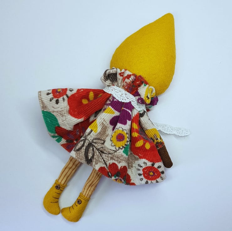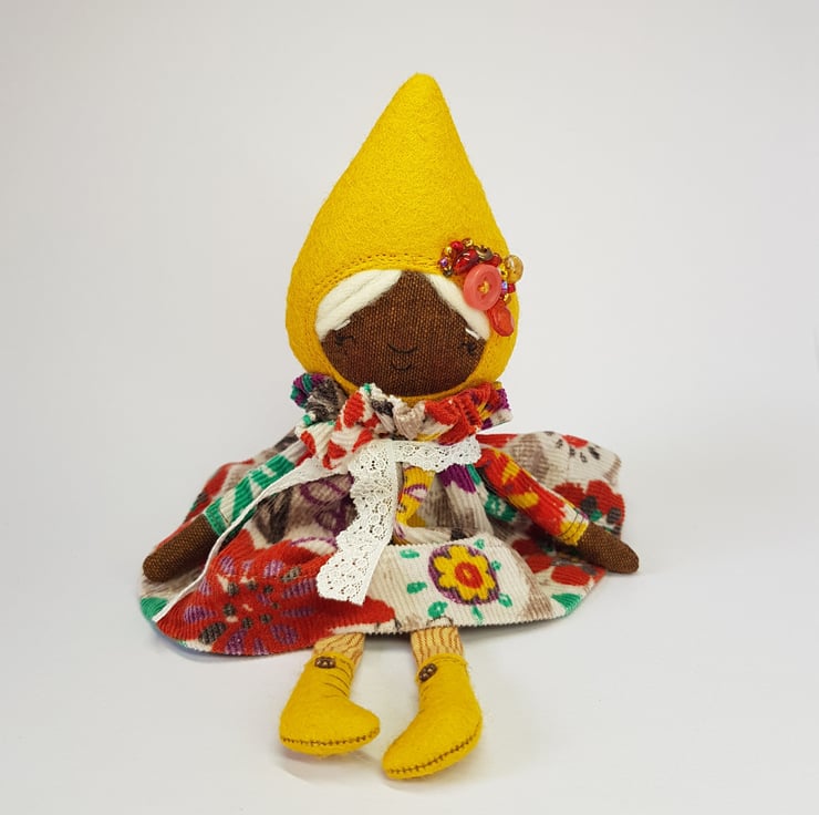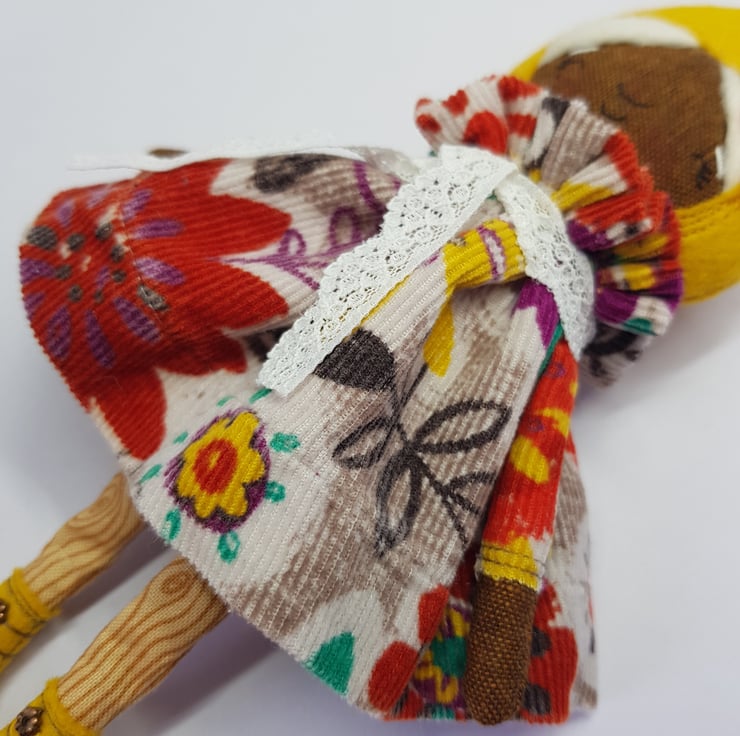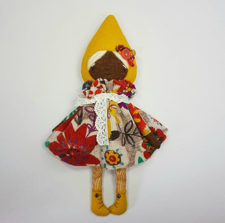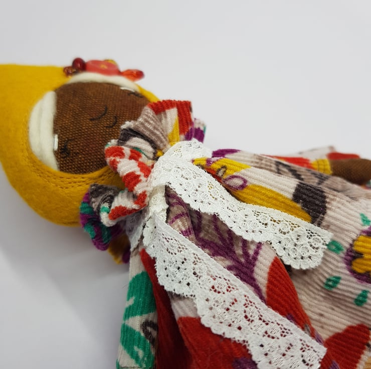 Handmade doll with hand embroidered face and upcycled cord dress fabric. She also wears a little lace trim scarf. This little doll has felt boots with hand sewn laces and wood print legs. She has natural wool hair and an upcycled bead headpiece sewn into place. She measures roughly 20cm tall. This is for decorative purposes only and not a toy.