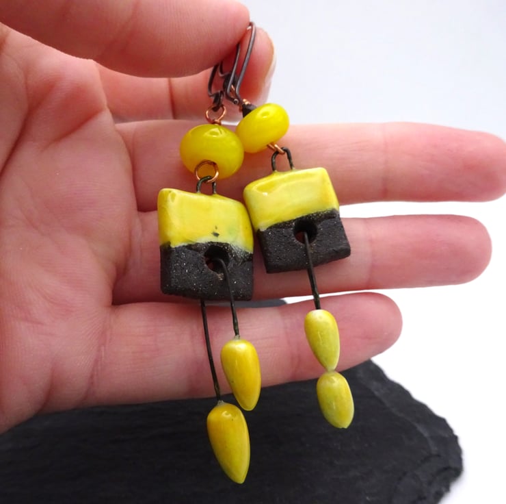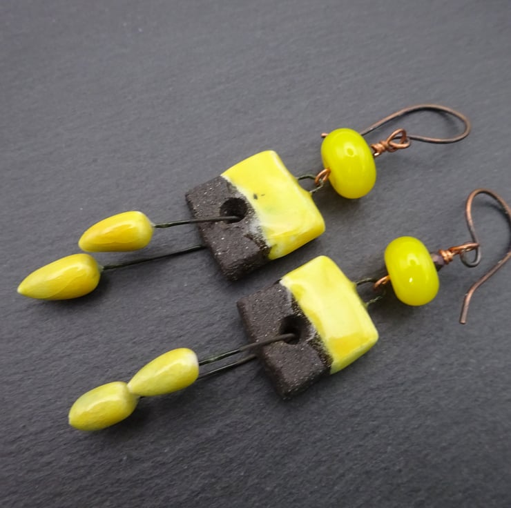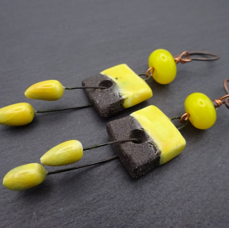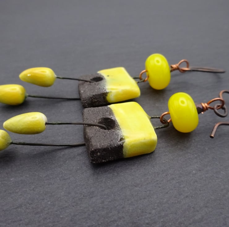 A pair of earrings made with handmade copper ear wires, handmade lampwork glass beads and handmade ceramic drops which feature a yellow glaze.