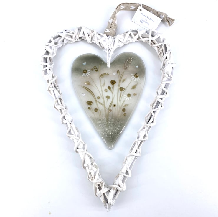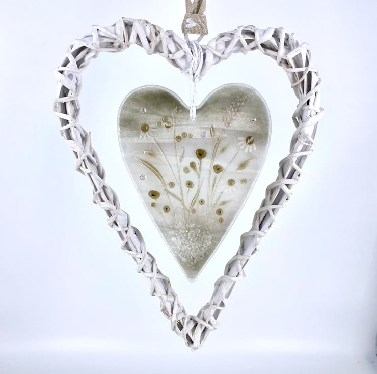 The glass is suspended in the middle of a white wicker heart and piece has been finished with a length of co-ordinating ribbon.