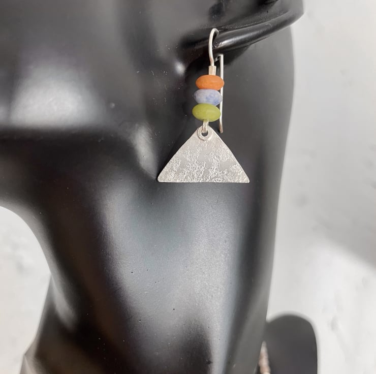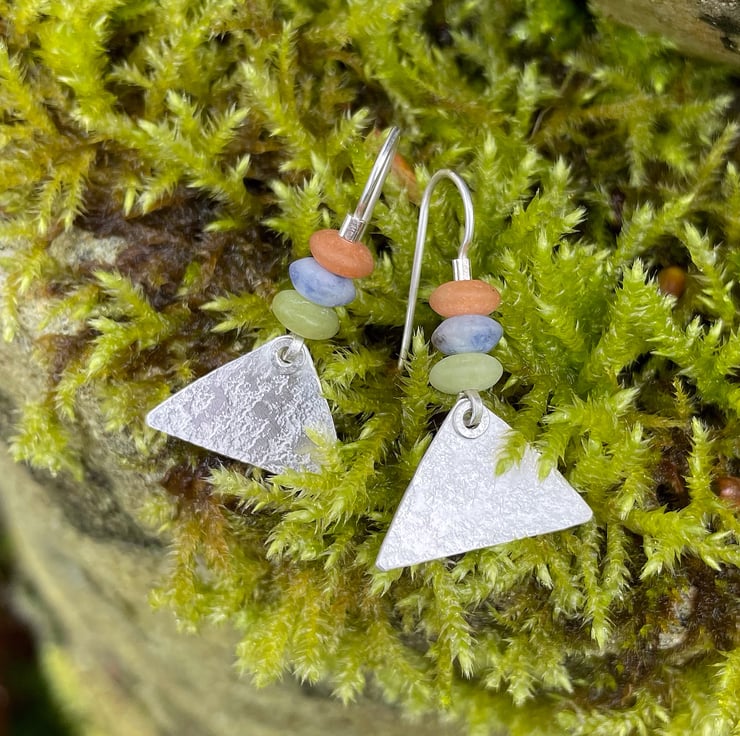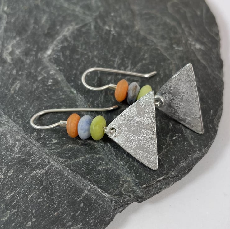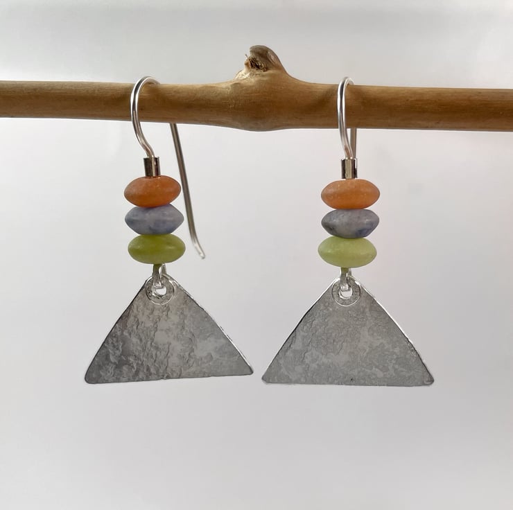 Triangles of silver with a beaten texture and a feature raised eyelet hang from handmade hooks that have a trio of bright matte gemstone beads.
