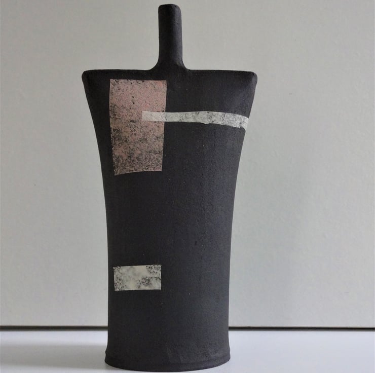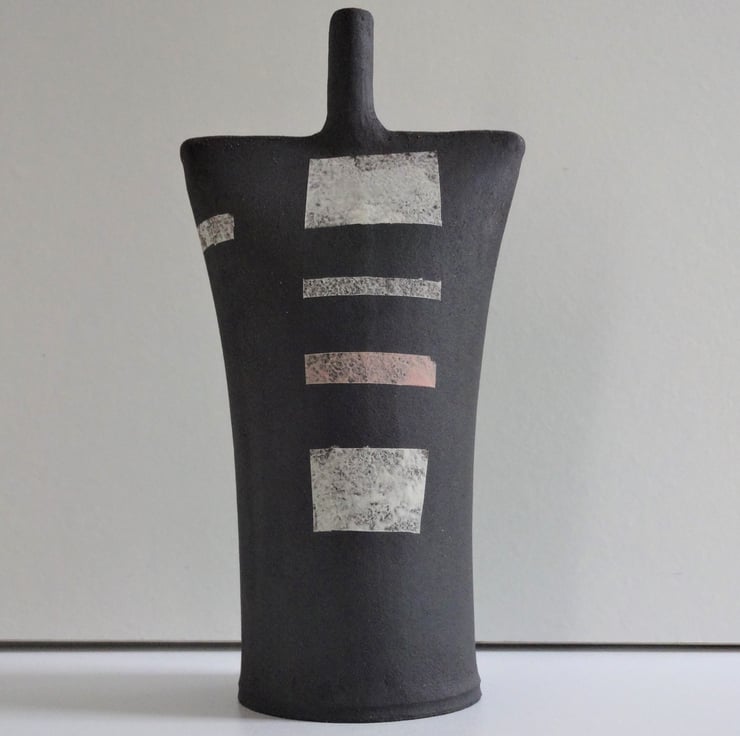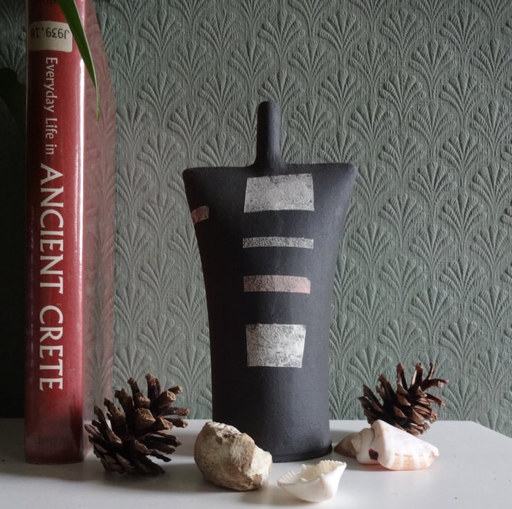 This sculptural ceramic is from my Kindred Collection of abstract forms, and makes an unusual minimalist focal point in any room. Kindred pieces can also be used to contribute to contemplation during yoga and mindfulness meditation, their simple forms promoting a calming atmosphere for practice. I created the piece from black stoneware clay, and added decorative panels and motifs in muted shades of soft blossom pink and white. There are different but related motifs back and front of the form with a band of white wrapping around from front to back to connect the two facets. Though of course which you choose as front, and which as back is entirely up to you! Each piece in the Kindred Collection is different because each is entirely handmade – I don’t use moulds or transfers. So, each has a personality of its own, and a name, this one is Colm. 18cms high.