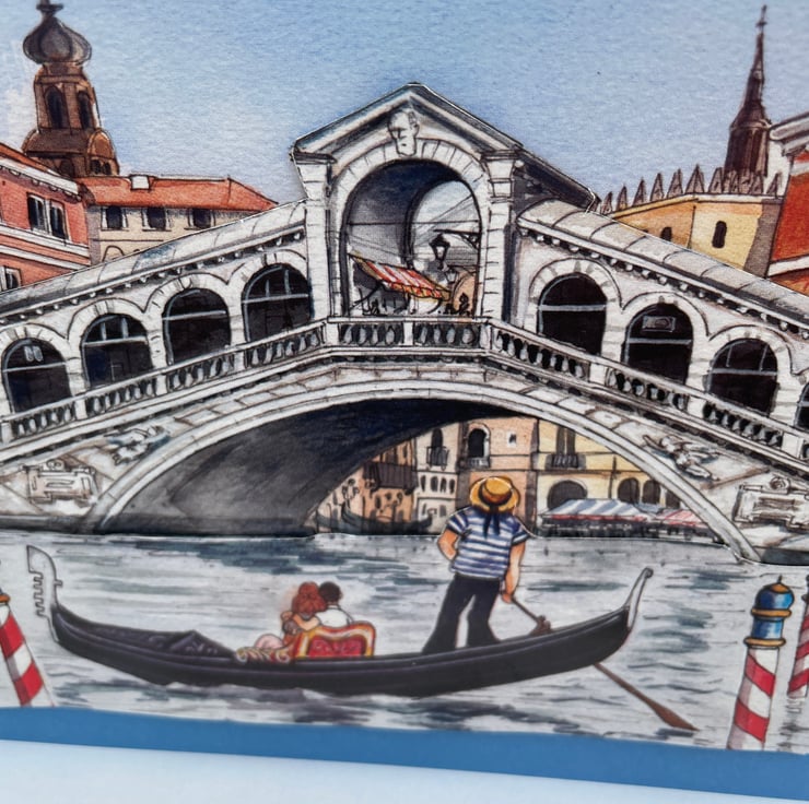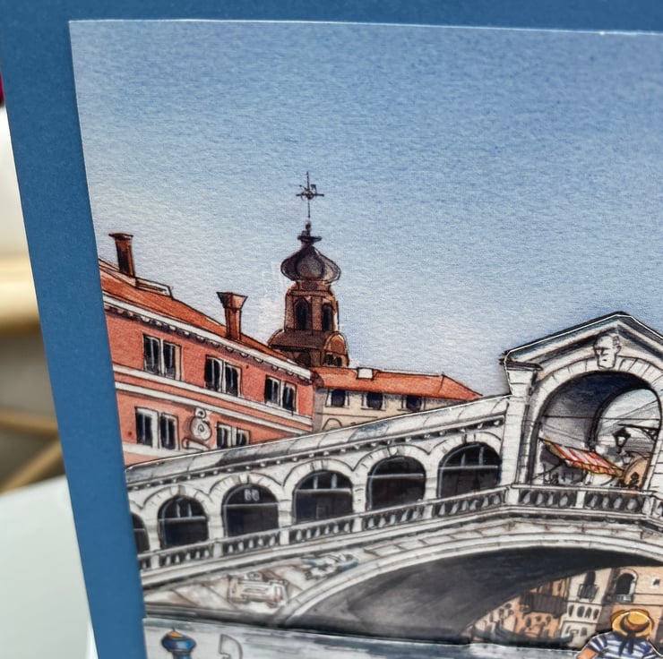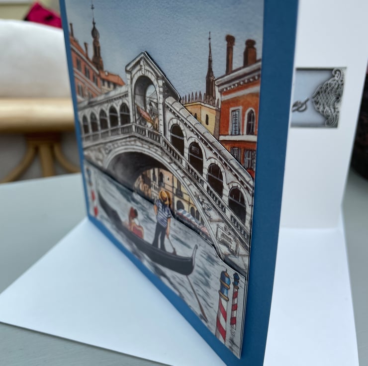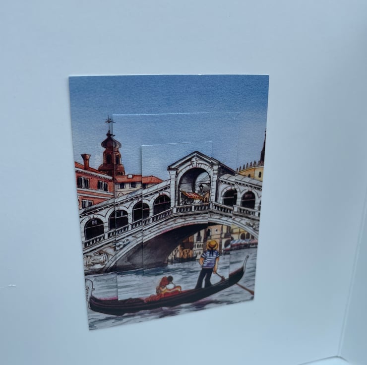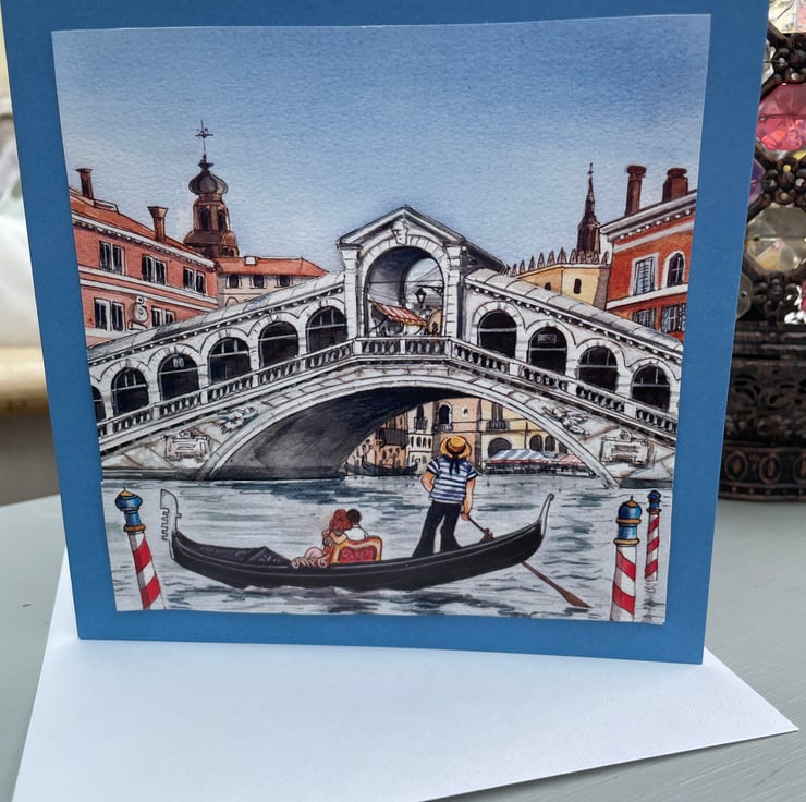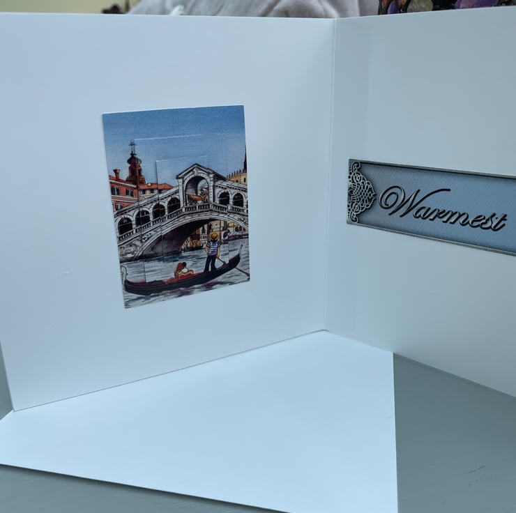 One of the most romantic places in the world, Venice. This 15x15cm card has a loved up couple having a romantic ride in a Gondola, what could be better to send your other half on an anniversary. Maybe it is a special anniversary, a honeymoon, a beautiful memory of a special time. What could be better than sending this fabulous card. The card has a blue background with the main layered image on top. There is a couple in a Gondola with a traditionally dressed Gondolier serenading them as they pass under the Rialto bridge. Inside the card has a matching image and Warmest wishes as the greeting.