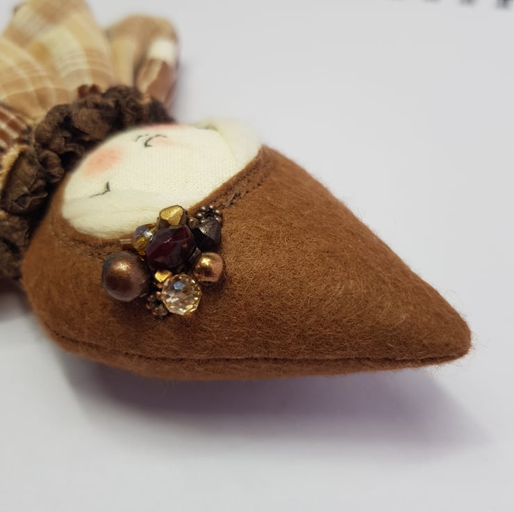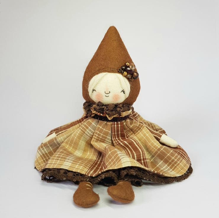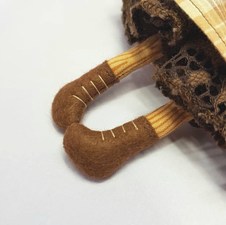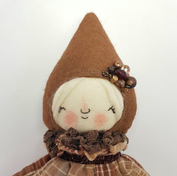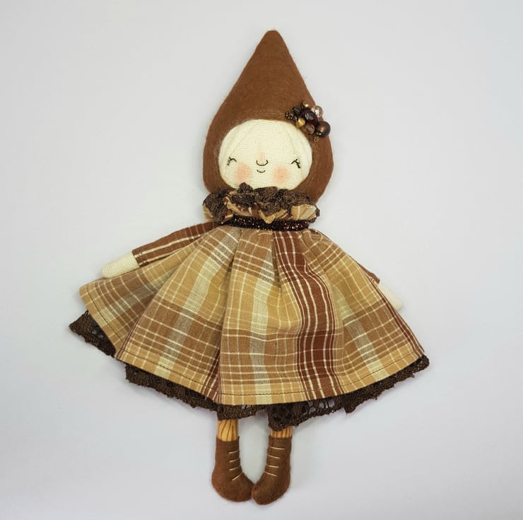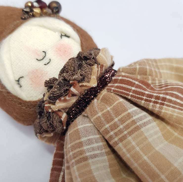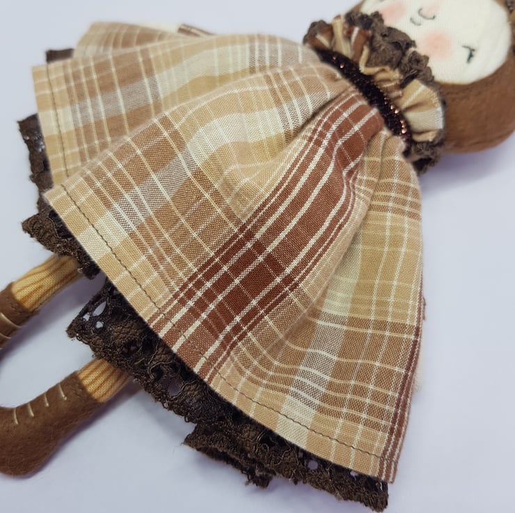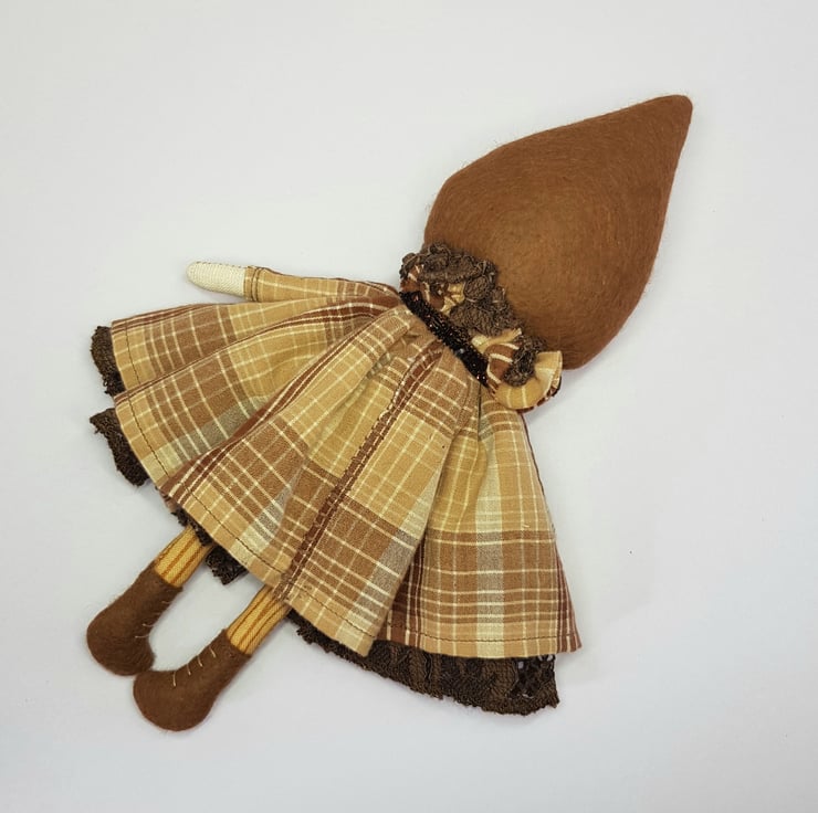 Handmade doll with hand embroidered face and upcycled chequered dress with lace underskirt. She wears a sparkly brown trim around her neck. This little doll has felt boots with hand sewn laces and wood print legs. She has natural wool hair and an upcycled bead and lace headpiece sewn into place. She measures roughly 20cm tall. This is for decorative purposes only and not a toy.