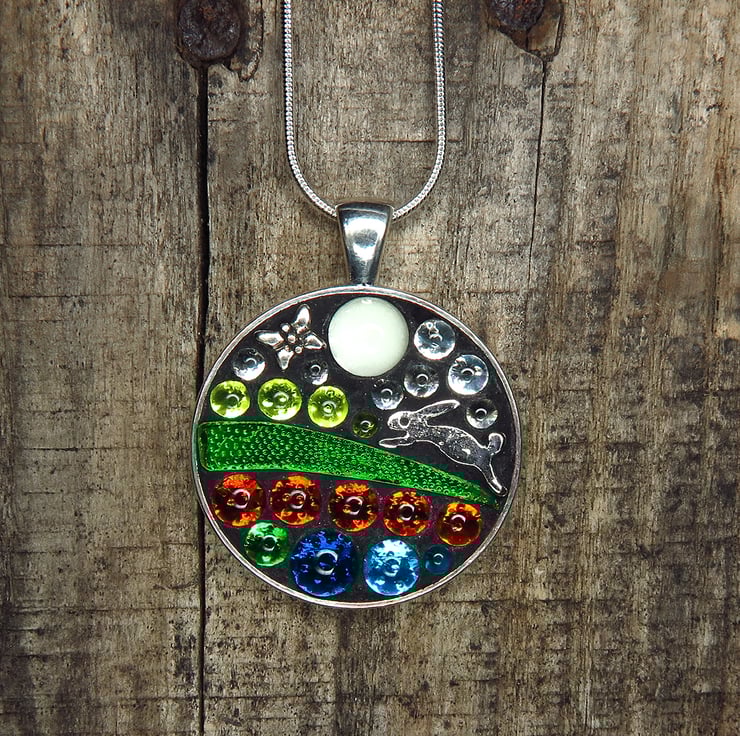 A stained glass and bead pendant depicting a cute little rabbit chasing a butterfly. Also featuring a glow in the dark moon bead.