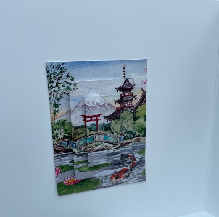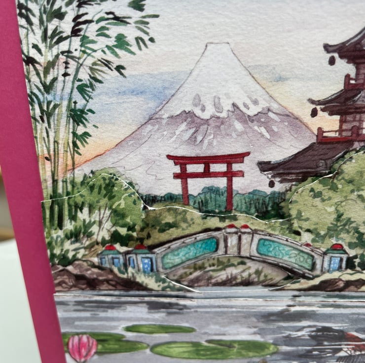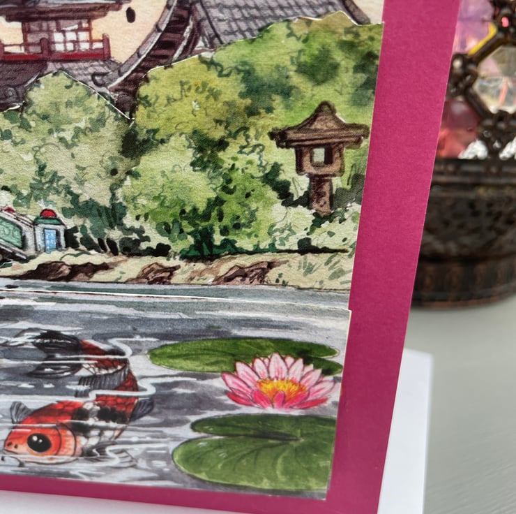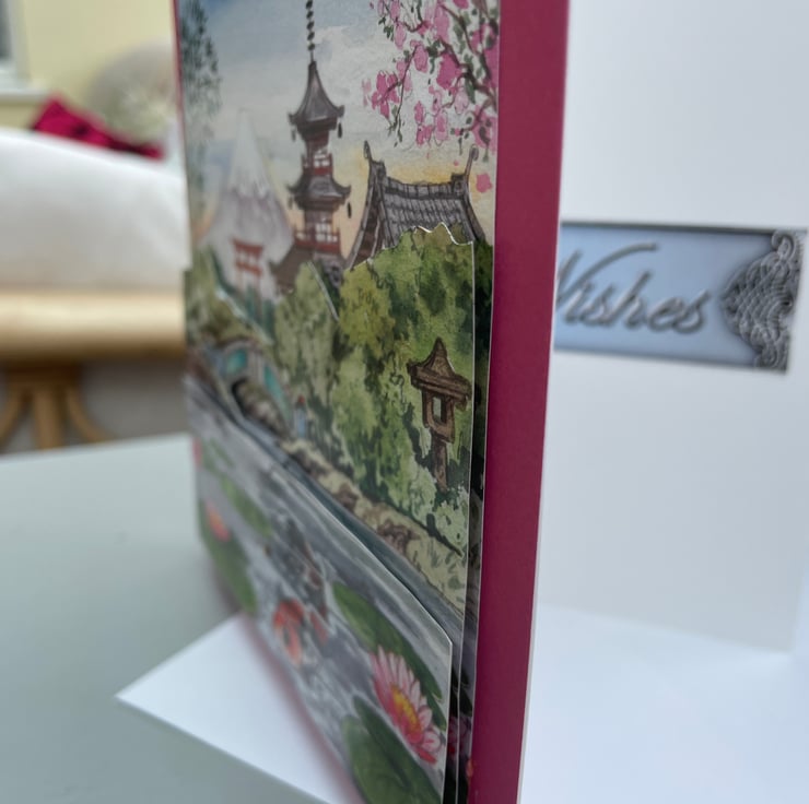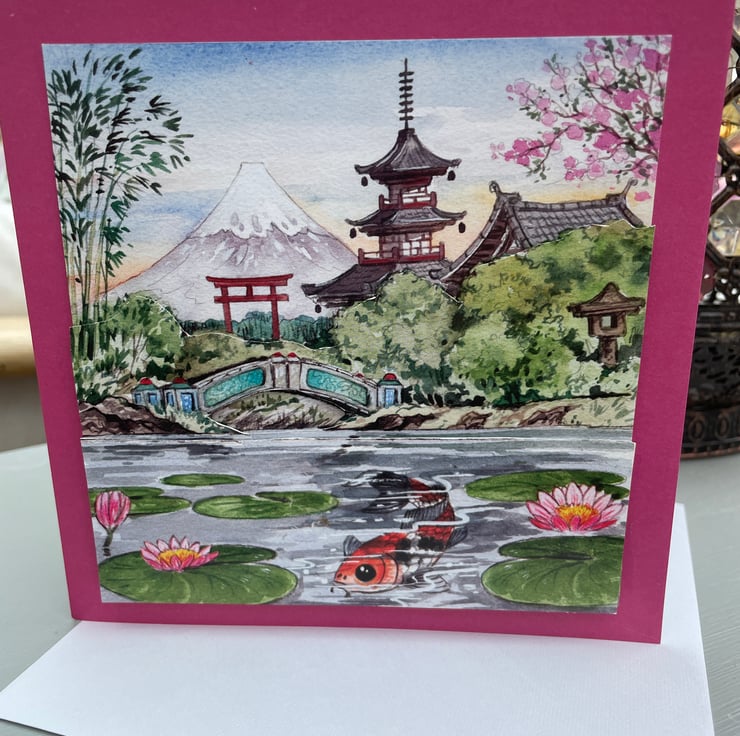 A beautiful tranquil scene of a Japanese garden. This 15x15cm has a lovely picture of a Japanese garden with a Koi carp pond, Pergoda, bridge and a view of Mount Fuji. Water lilies float on the pond, bamboo and cherry blossom add to the scene. A beautiful card to send for a birthday, sending love or thinking of you. Inside the card has a matching image and the greeting Best wishes.